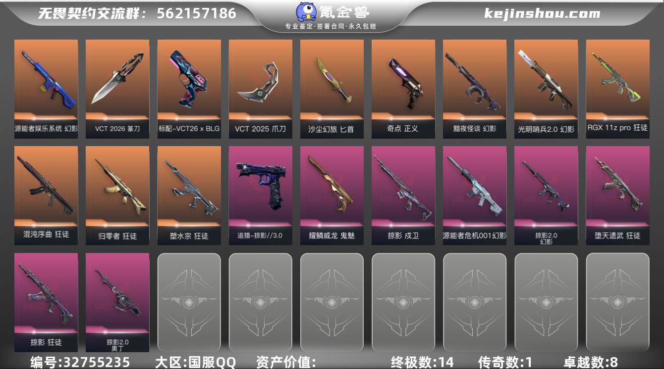 【942825】【套装】:VCT 2026 赛季套装,VCT 2025 赛季套装,回火礼包:掠影套装,掠影//3.0套装 【英雄】:幻棱,炼狱,维斯,暮蝶,钛狐,壹决,铁臂,捷风,雷兹,幽影,不死鸟,贤者,猎枭,蝰蛇,零,芮娜,奇乐,尚勃勒,霓虹,斯凯,夜露,星礈,K/O,海神,盖可,黑梦,钢锁 【近战武器】:近战武器-VCT 2026 篆刀,近战武器-影蝶,近战武器-剥皮小刀,近战武器-VCT 2025 爪刀,近战武器-镭切,近战武器-沙尘幻旅 匕首 【狂徒】:狂徒-归零者,狂徒-混沌序曲,狂徒-塑水宗,狂徒-RGX 11z Pro,狂徒-堕天遗武,狂徒-掠影,狂徒-沙尘幻旅 【幻影】:幻影-黯夜怪谈,幻影-光明哨兵//2.0,幻影-源能者娱乐系统,幻影-源能者危机001,幻影-掠影//2.0 【戍卫】:戍卫-掠影,戍卫-萌彩剪影 【獠犬】:獠犬-胡桃狂想 【冥驹】:冥驹-胡桃狂想 【飞将】:飞将-沙尘幻旅 【战神】:战神-萌彩剪影 【奥丁】:奥丁-掠影//2.0 【判官】:判官-萌彩剪影 【骇灵】:骇灵-沙尘幻旅 【蜂刺】:蜂刺-胡桃狂想 【追猎】:追猎-掠影//3.0 【标配】:标配-超能偶像 【VCT手枪】:标配-VCT26 x BLG 【正义】:正义-奇点,正义-超限闪存,正义-沙尘幻旅,正义-复古浪潮,正义-纳米打击,正义...