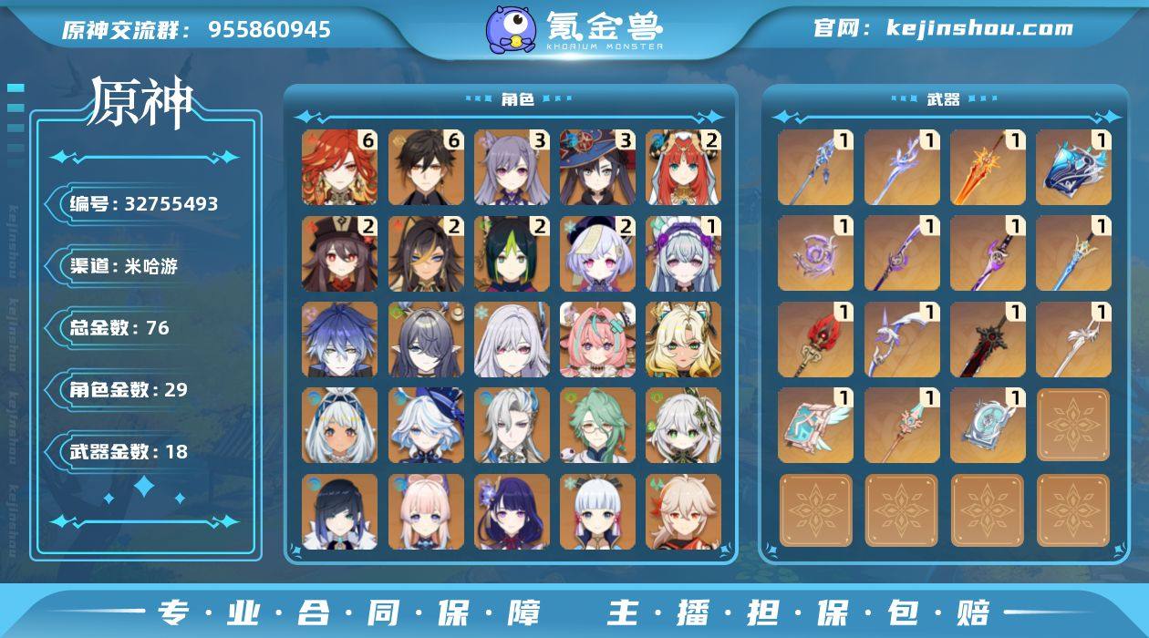邮箱: 不送邮/死邮 总黄数: 76 冒险等级: 60 6命金色角色: 满命钟离,满命玛薇卡 3命金色角色: 三命刻晴,三命莫娜 2命金色角色: 二命七七,二命胡桃,二命提纳里,二命妮露,二命迪希雅 1命金色角色: 一命梦见月瑞希 0命金色角色: 迪卢克,温迪,枫原万叶,神里绫华,琴,阿贝多,雷电将军,珊瑚宫心海,夜兰,纳西妲,白术,那维莱特,芙宁娜,玛拉妮,希诺宁,瓦雷莎,丝柯克,菈乌玛,菲林斯 拥有武器: 狼的末路,雾切之回光,四风原典,天空之卷,阿莫斯之弓,风鹰剑,天空之脊,护摩之杖,薙草之稻光,不灭月华,苍古自由之誓,万世流涌大典,焚曜千阳,苍耀,血染荒城 1精武器: 狼的末路,雾切之回光,四风原典,天空之卷,阿莫斯之弓,风鹰剑,天空之脊,护摩之杖,薙草之稻光,不灭月华,苍古自由之誓,万世流涌大典,焚曜千阳,苍耀,血染荒城
