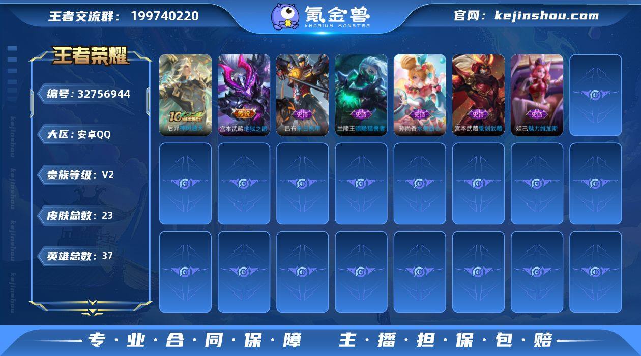 实名: 可修改 贵族等级: V2 英雄数: 37 皮肤数: 23 传说皮: 地狱之眼,神树通天