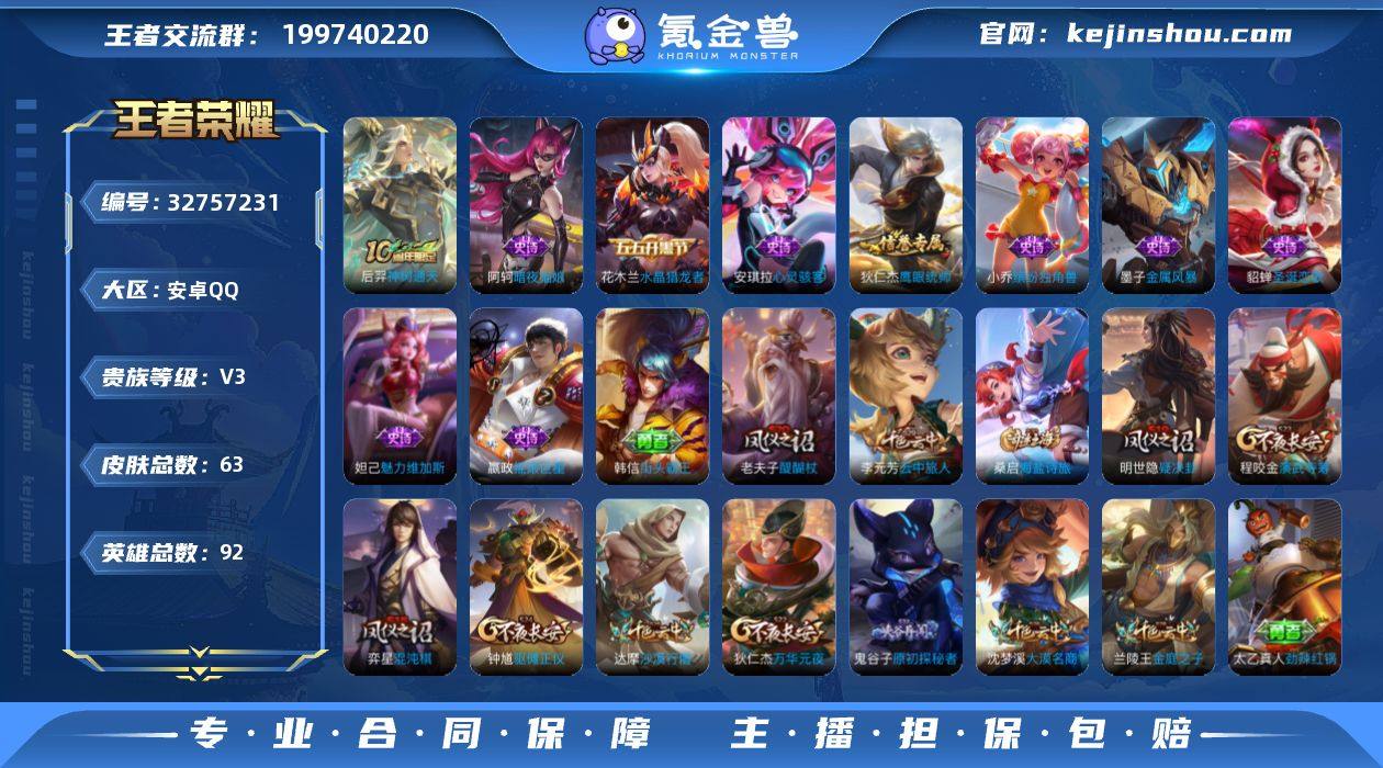 实名: 可修改 贵族等级: V3 英雄数: 92 皮肤数: 63 传说皮: 神树通天