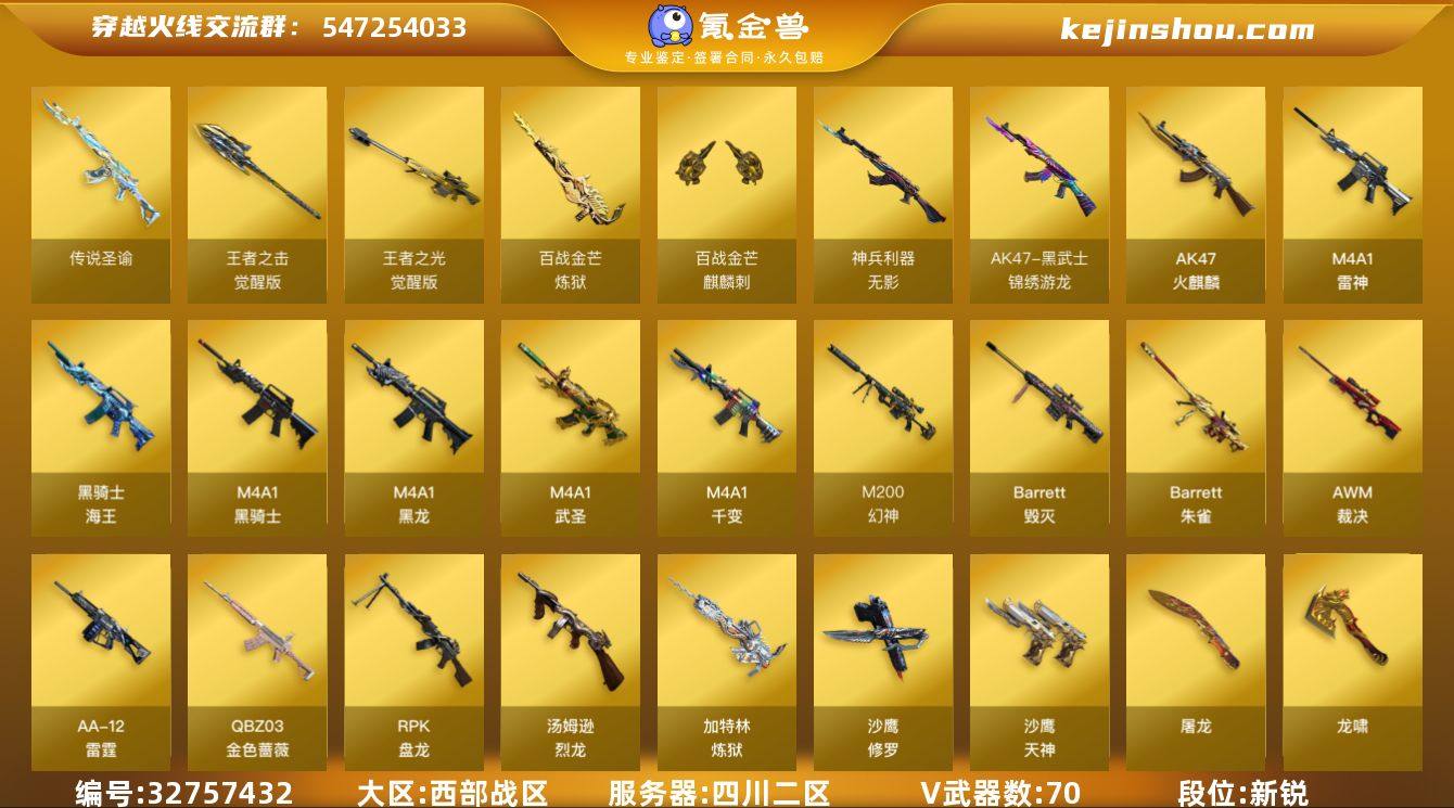 四川二区-75V-2王者武器数-0炫金武器数 【传说武器】:传说圣谕 【传说角色】:传说星骇 【热门武器】:传说圣谕,QBZ03-金色蔷薇,M200-幻神,死亡之眼,M4A1-黑骑士,汤姆逊-烈龙*6,RPK-盘龙,加特林-炼狱,斯泰尔-蝴蝶,沙鹰-修罗*4 【音效卡】:M200-幻神音效卡,M4A1-黑骑士音效卡,Barrett-毁灭音效卡,AWM-裁决音效卡,沙鹰-修罗-盛典舞曲音效卡*2,Barrett-碧霄极光音效卡,炼狱-百战金芒-庆典舞曲音效卡 【皮肤】:AWM-裁决-凤灵皮肤,M4A1-再燃火线,雷神-神秘按键 皮肤,火麒麟-雷神,火麒麟-平天大圣,火麒麟-心动糖果,毁灭-黑大圣皮肤,毁灭-航天科技皮肤,毁灭-英雄计划 皮肤,M4A1-千变-孔明皮肤,黑骑士-暗月,战神-粉色甜心皮肤,战神-紫绶金章皮肤,AK47-B-常胜将军-曹操*2,AK47-B-常胜将军-孙权*2,天龙-能量核心,AWM-天龙-传奇白鲨,炼狱-星空,轻型军用手斧-再燃火线 【角色】:葵,樱,王者玲珑-小乔,暗夜-X,北极狐-X,初恋灵狐,风暴女,嘉年华灵狐,娟娟,灵狐者-黄金海岸,曼陀罗-X,潘多拉-X,潘多拉-甜心教官,潜龙队-X,邱刚敖,青霞仙子,斯沃特-X,蜀雪,铁骑荣耀,兔囡囡,新娜塔莎,影武者-X 【人偶武器】:斯泰尔-蝴蝶,AWM-灵狐-15周...