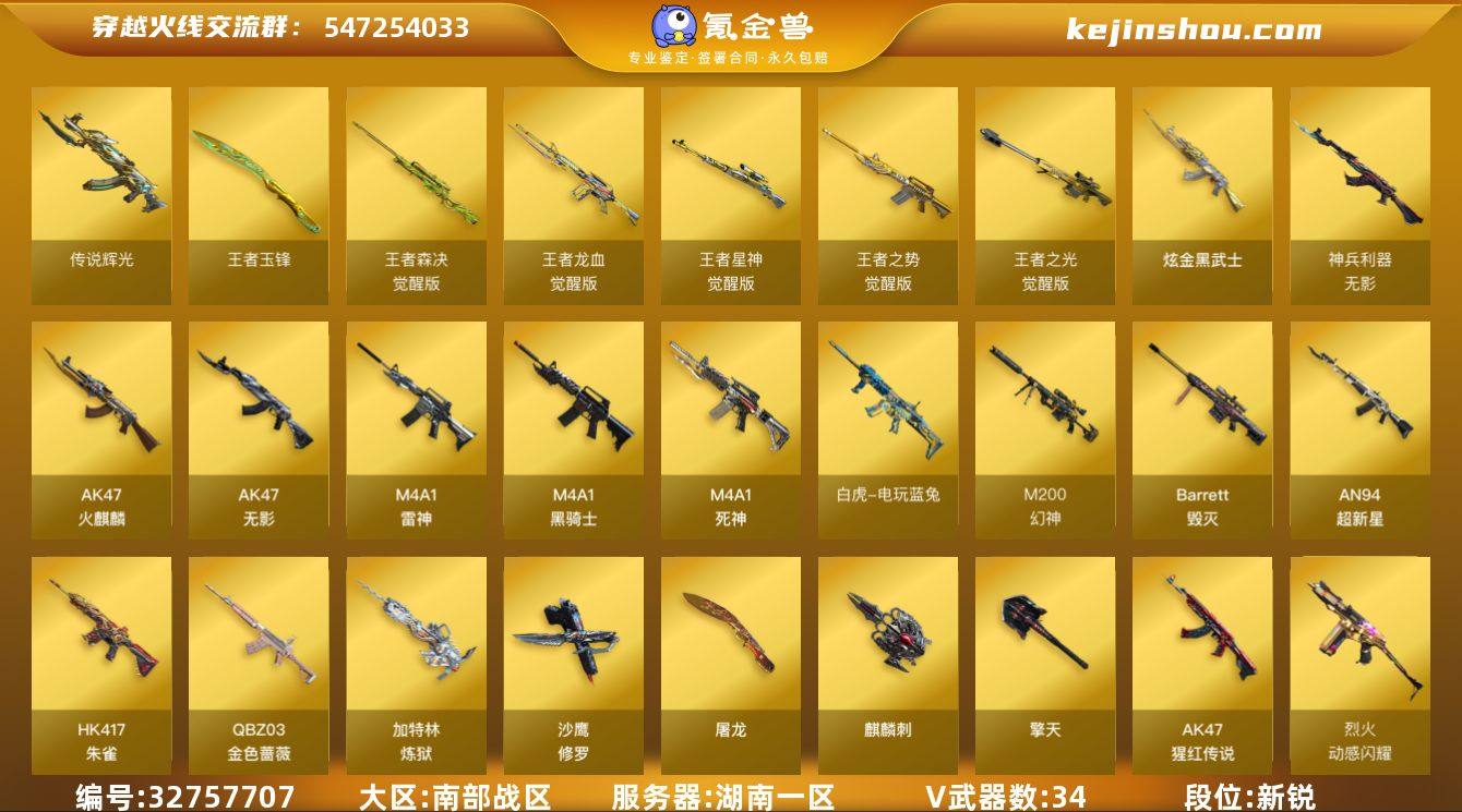 湖南一区-37V-6王者-1炫金 【传说武器】:传说辉光 【传说角色】:传说艾莉莎 【热门武器】:传说辉光,QBZ03-金色蔷薇,HK417-朱雀,M4A1-青龙,M200-幻神,白虎-电玩蓝兔,炼狱-迷你小钢,M4A1-黑骑士,加特林-炼狱,羊驼玩偶,沙鹰-修罗*4,金刚伞 【王者炫金武器】:王者玉锋,炫金武士 【音效卡】:M4A1-黑骑士音效卡 【皮肤】:幻神-降龙,火麒麟-雷神*2,火麒麟-轻羽皮肤,火麒麟-心动糖果,毁灭耀金皮肤,毁灭-黑大圣皮肤,M4A1-黑龙-361,AK47-B-常胜将军-曹操,AK47-B-常胜将军-孙权 【角色】:葵,隼,王者潘多拉,王者炽天使,乔伊教练,暗夜-X,北极狐-X,风暴女,虎妞,嘉年华灵狐,灵动武士,灵狐者-X,灵狐者-黄金海岸,曼陀罗-X,潘多拉-X,青霞仙子,斯沃特-X,蜀雪,兔囡囡,新娜塔莎,雪莉杨-摸金校尉,夜玫瑰-幻能朋克,夜玫瑰-宠粉,樱-战斗天使 【人偶武器】:天龙-曼陀罗,火麒麟-灵狐,炼狱-迷你小钢,AWM-灵狐-15周年嘉年华,迷你裂空之翼,迷你牛魔王,迷你波特博士*4,夺魂,迷你火种*2,生化手雷-机甲核心,深渊终结者手雷,迷你超能女侍,迷你巨石泰坦-魔花研究所 【暴走生化】:异变清道夫,超级对讲机 【挑战大师】:神圣爆裂者III,AK47-冰...