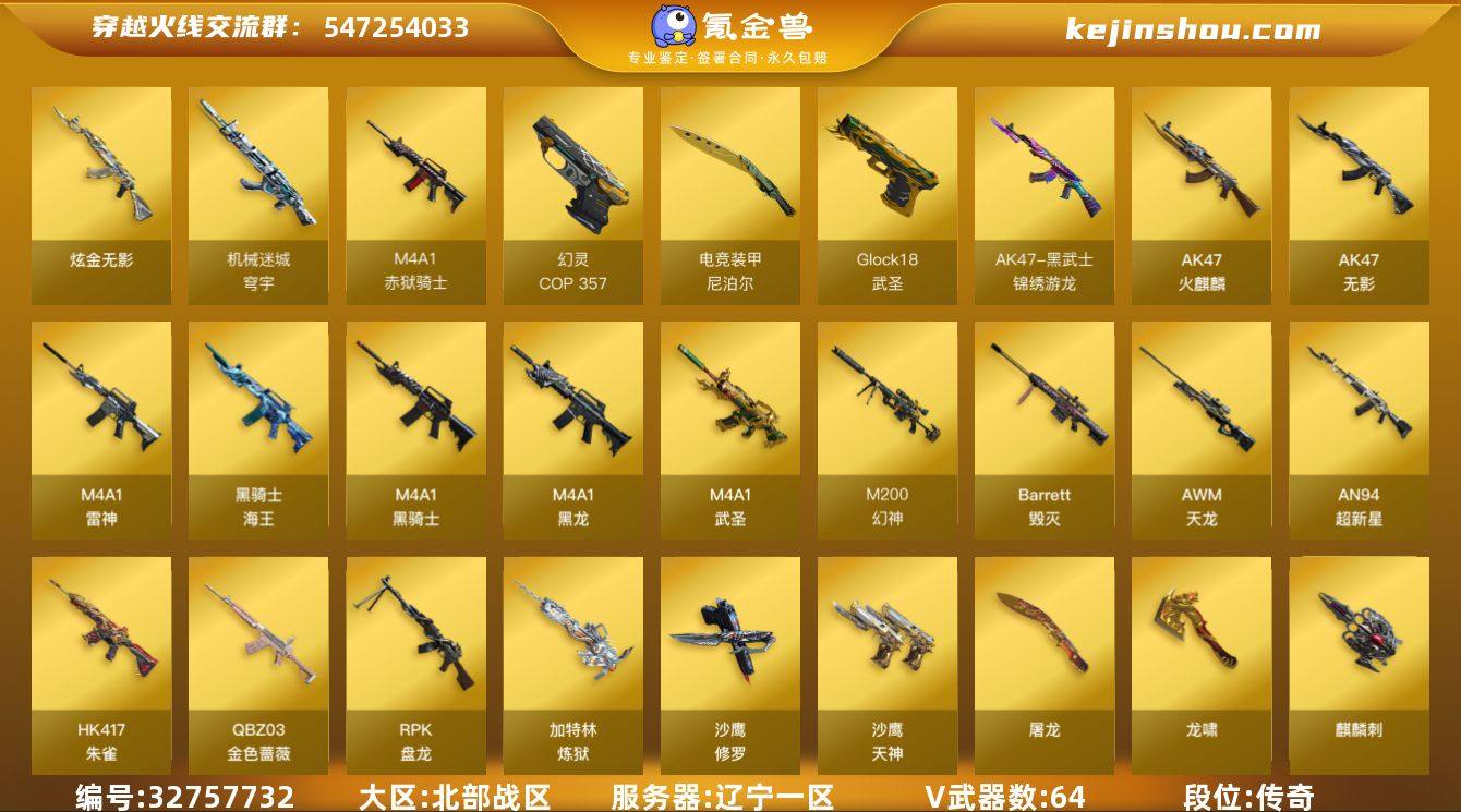【942890】辽宁一区-68V-1王者武器数-1炫金武器数 【热门武器】:QBZ03-金色蔷薇,M14EBR-玄武,HK417-朱雀,M200-幻神,M4A1-黑骑士,RPK-盘龙,加特林-炼狱,COP 357-幻灵,沙鹰-修罗*2 【王者炫金武器】:炫金无影 【音效卡】:M4A1-黑骑士音效卡 【皮肤】:白虎-霓虹机甲 皮肤,雷神-暗月,雷神-星空,火麒麟-轻羽皮肤,火麒麟-平天大圣,火麒麟-百城,毁灭-暗月,毁灭耀金皮肤,毁灭-星空,毁灭-神秘黑洞皮肤,毁灭-英雄计划 皮肤,M4A1-千变-孔明皮肤,黑骑士耀金皮肤,黑骑士-伏羲,无影-能量核心,天启-暗月,天龙-秘银*2,修罗-能量核心,修罗耀金皮肤,屠龙-春桃 皮肤,屠龙-巅峰荣耀 皮肤 【角色】:葵,星际战将,战地猎狐,王者-迷迭香,奇洋探员,乔伊教练,修道士,云海玲珑,初恋灵狐,电竞少女,风暴女,虎妞,嘉年华灵狐,灵狐者-七夕宝贝,灵狐者-职业经理,麻雀,邱刚敖,斯沃特-X,影武者-X,幽,团团 【人偶武器】:天龙-曼陀罗,深渊终结者手雷*2,闪光弹-小乔,迷你艾比,迷你巨石泰坦-魔花研究所 【暴走生化】:超级对讲机 【挑战大师】:激光毁灭者III,神圣爆裂者-末日III 【英雄级武器】:AK47-火麒麟,M4A1-黑龙,M4A1-雷神,M4A1-黑骑士,AK47-...