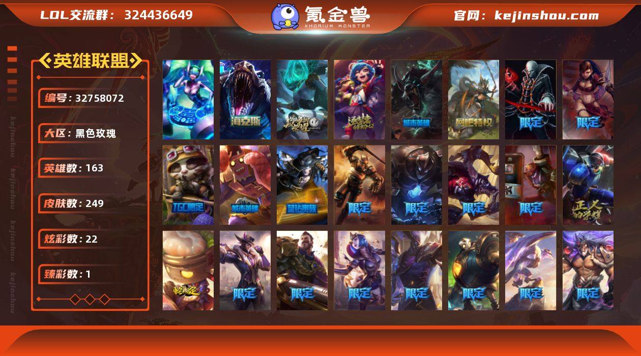 【店主推荐捡漏号】白银段位-163英雄-249皮肤-22炫彩-1终极-3神话-41限定-24传说-55史诗 【神话皮肤】:十周年纪念安妮,源代码乐芙兰 【海克斯皮肤】:海克斯科技雷克顿 【臻彩皮肤】:无畏骑士瑟庄妮赤子初心 【年限皮肤】:点心宝贝阿木木 【冰雪限定】:幸福女神乐芙兰,圣诞狂欢基兰,胡桃夹子萨科,冬季仙境卡尔玛,喜庆之树茂凯,圣诞老人古拉加斯,圣诞驯鹿克格莫,魄罗骑士瑟庄妮 【终极皮肤】:DJ娑娜 【限定皮肤】:诺斯费拉图弗拉基米尔,Fnatic古拉加斯,暗杀星蒙多,暗杀星努努和威朗普,暗杀星慎,SSW辛吉德,SSW图奇,SSW泰隆,胜利枪神格雷福斯,胜利女神奥莉安娜,胜利之剑亚托克斯,胜利机器人布里茨,胜利凤凰艾尼维亚,胜利之王泰达米尔,胜利巨口克格莫,胜利之运崔斯特,胜利女神菲奥娜,海贼瑞兹,南瓜头费德提克,灵魂收割者索拉卡,机械迷城加里奥,蓝色忧郁崔斯特,蒙多蒙多,密林猎手提莫,女猎手希维尔,暗影沃里克,野兽猎人瑟庄妮,都铎王朝图奇,防暴士兵辛吉德,防暴天使凯尔,警用试作体K9内瑟斯 【传说皮肤】:战场女武神凯尔,源计划林易,霸天零式赛恩,提莫约德尔人的一大步,烈焰雄心崔丝塔娜,绅士科加斯,律政大亨蒙多,女警狙击凯...