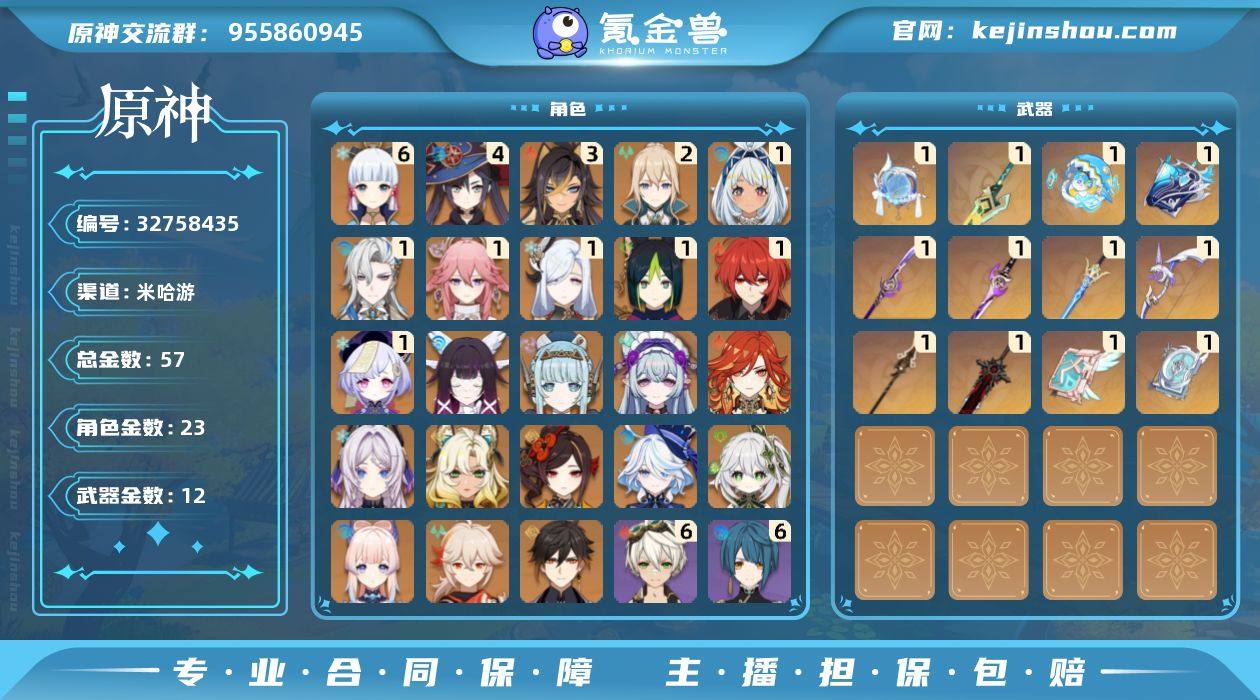 原神号(安卓官服)自己玩了几年,角色多,练度高,满命绫华,专武、资源、圣遗物、原石、突破材料、深渊材料、成就、探索度都基本百分之八九十,祝胜之霜,启圣之尘都很多,所有深渊每期都能打满,直接上手玩没问题~