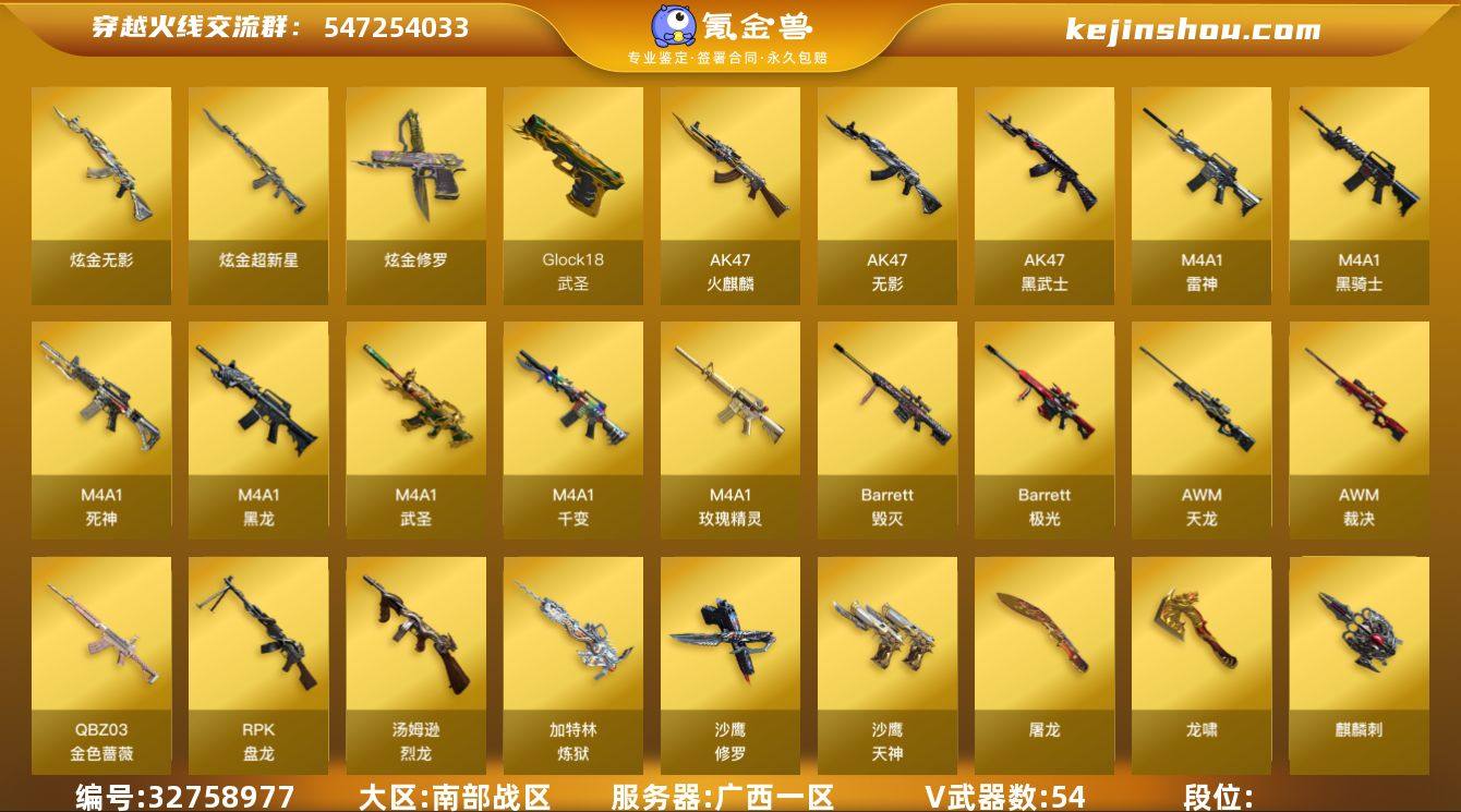 54V/100级/元帅/3炫金/4英雄/毁灭三件套/QBZ03-金色蔷薇/死亡之眼/M4A1-黑骑士/汤姆逊-烈龙/RPK-盘龙/加特林-炼狱/沙鹰-修罗/炫金无影/炫金超新星/炫金修罗/Barrett-毁灭音效卡/裁决-星际旅行 皮肤/雷神-暗月/雷神-宇航兔/火麒麟-平天大圣/毁灭耀金皮肤/毁灭-星空/毁灭-英雄计划 皮肤/黑龙-能量核心/黑骑士-暗月/无影-暗月/无影耀金皮肤/天龙-秘银/极光-能量核心/修罗-能量核心/天神-暗月/葵/樱/瞳/狐影/幻面灵狐/娟娟/零-水下丽影/潘多拉-X/兔囡囡/新娜塔莎/影武者-X/迷你生化手雷/生化手雷-机甲核心/超级对讲机/6烈龙/6盘龙/冰龙粉碎者-白马银枪/阐释者/M4A1-千变/AK47-火麒麟/M4A1-黑龙/M4A1-雷神/AK47-无影/M4A1-死神/AK47-黑武士/M4A1-武圣/M4A1-玫瑰精灵/AWM-天龙/Barrett-毁灭/Barrett-极光/AWM-裁决/沙鹰-天神/Glock18-武圣/屠龙/龙啸/擎天/麒麟刺/屠龙-电竞之星/源·火麒麟/魂·M4A1-雷神-化蛇/魂·雷神-新春神龙/源·AK47-黑武士/源·HK417-朱雀/魂·裁决-羽掣/魂·毁灭-神秘黑洞/魂·修罗-现代金属/魂·龙啸-秦师/炫彩背包/虎牙炫彩背包/超级背包/黄金生化钩/绿色巨人/灵魂忍者/变异宝贝/迷雾幽灵/夺命之镰/防化服/防弹头盔/防弹衣/C4工具钳/手雷包
