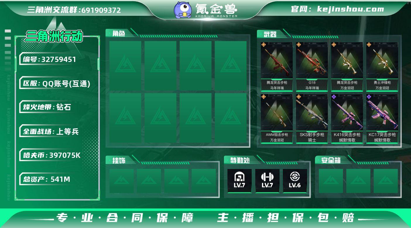 【942917】541m总资产-397075k哈夫币-60烽火等级-钻石-14战场等级-上等兵 【干员外观】:蛊-不羁人生 【近战皮肤】:近战-黑鹰 【传说外观】:AUG突击步枪-悠然茶歇,腾龙突击步枪-马年祥瑞,腾龙突击步枪-万金泪冠,MK47突击步枪-悠然茶歇,UZI冲锋枪-悠然茶歇,勇士冲锋枪-万金泪冠,QCQ171冲锋枪-不羁人生,SKS射手步枪-骑士,AWM狙击步枪-万金泪冠,G18-马年祥瑞 【史诗外观】:K416突击步枪-冬日风情,K416突击步枪-阿萨拉特攻,K416突击步枪-缄默情歌,SG552突击步枪-深海恐惧,SCAR-H战斗步枪-囚徒,G3战斗步枪-哈夫克警备,KC17突击步枪-缄默情歌,MP5冲锋枪-竞技风,MP7冲锋枪-六套之力,S12K霰弹枪-缄默情歌,QJB201轻机枪-炽焰,M14射手步枪-工业狂潮,SV-98狙击步枪-囚徒,M700狙击步枪-哈夫克警备 【稀有外观】:SG552突击步枪-天际线,AKM突击步枪-肃杀,K416突击步枪-一帆风顺,SG552突击步枪-贴花艺术, AK-12突击步枪-马年新春,SCAR-H战斗步枪-荣耀列队,Vector冲锋枪-先锋,UZI冲锋枪-前沿科技,野牛冲锋枪-前沿科技,SMG-45冲锋枪-行动开启,SMG-45冲锋枪-幻影结构,勇士冲锋枪-冰天雪地,QCQ171冲锋枪-银鹭,M249轻机枪-毛鲁斯之力,M249轻机枪-冰天雪地...