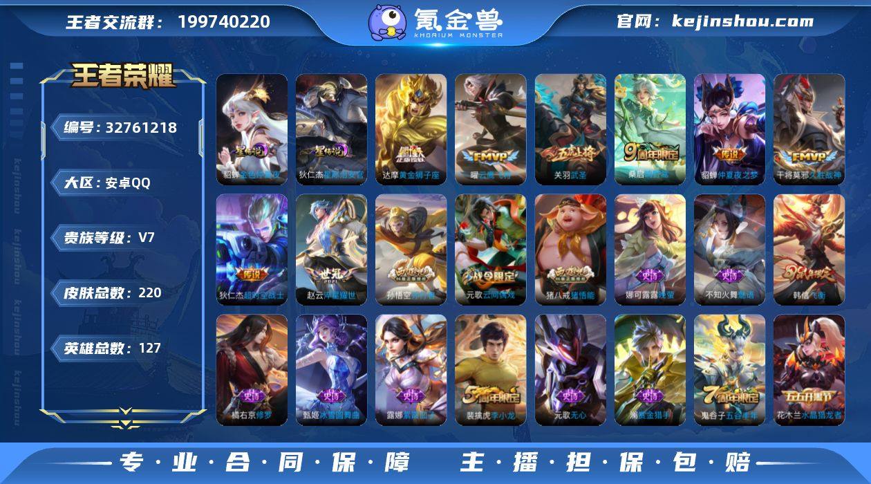 安卓Q-V0-尊贵铂金IV段位-127英雄-220皮肤-8传说-54史诗【传说皮肤】:桑启鸣野蒿,赵云淬星耀世,关羽武圣,曜云鹰飞将,干将莫邪久胜战神,达摩黄金狮子座,貂蝉仲夏夜之梦,狄仁杰超时空战士【限定皮肤】:姜子牙天穹之誓,杨戬破阵退雄兵,狄仁杰阴阳师,赵云皇家上将,墨子神迹守卫,嬴政优雅恋人,孙尚香蔷薇恋人,鲁班七号狮舞东方,庄周高山流水,阿轲迷踪丽影,元歌云间偶戏,元歌无心,夏侯惇朔风刀,狄仁杰魔术师,狄仁杰万华元夜,达摩沙漠行僧,项羽海滩派对,老夫子醍醐杖,老夫子航海奇遇记,关羽武圣,程咬金演武夺筹,刘邦夺宝奇兵,韩信飞衡,兰陵王金庭之子,花木兰瑞麟志,亚瑟潮玩骑士王,孙悟空孙行者,牛魔御旌,后羿圣弓游侠,李元芳银河之约,李元芳云中旅人,钟馗神迹守卫,钟馗驱傩正仪,女娲朔望之晖,干将莫邪真爱魔法,雅典娜黎明之约,鬼谷子原初探秘者,鬼谷子五谷丰年,苏烈千军破阵,百里玄策原初追逐者,弈星混沌棋,梦奇顽趣,沈梦溪星空之诺,沈梦溪大漠名商,明世隐疑决卦,裴擒虎李小龙,裴擒虎擒涛扼浪,狂铁御狮,米莱狄御霄,云中君纤云弄巧,盾山御銮,猪八戒猪悟能,嫦娥拒霜思,桑启海盐诗旅,艾琳女武神,阿古朵江河有灵,张良...