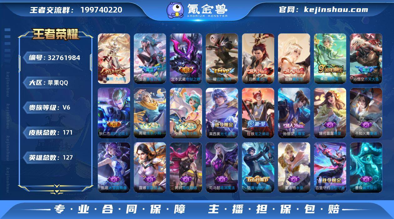 苹果Q-V6-最强王者段位-127英雄-171皮肤-9传说-37史诗【英雄全皮】:孙权全皮【传说皮肤】:澜愿照九州拓,桑启鸣野蒿,亚连落雪白狼,吕布曦玄引,貂蝉曦玄引,孙悟空齐天大圣,曜云鹰飞将,宫本武藏地狱之眼,狄仁杰超时空战士【限定皮肤】:姜子牙天穹之誓,狄仁杰阴阳师,赵云皇家上将,高渐离玩趣恶龙,狄仁杰魔术师,狄仁杰万华元夜,达摩沙漠行僧,项羽海滩派对,老夫子醍醐杖,兰陵王金庭之子,孙悟空至尊宝,孙悟空齐天大圣,李元芳云中旅人,太乙真人饕餮,鬼谷子原初探秘者,苏烈千军破阵,弈星混沌棋,沈梦溪大漠名商,明世隐疑决卦,鲁班大师探海日志,桑启海盐诗旅,张良古海寻踪,鬼谷子天穹祈灯,吕布曦玄引,貂蝉曦玄引,亚连落雪白狼,沈梦溪龙舞盛年,刘邦剑破天穹,周瑜熔金海岸【年限皮肤】:澜愿照九州拓【赛季限定】:太乙真人饕餮,弈星混沌棋,明世隐疑决卦,老夫子醍醐杖,鬼谷子原初探秘者,狄仁杰万华元夜,苏烈千军破阵,达摩沙漠行僧,兰陵王金庭之子,沈梦溪大漠名商,李元芳云中旅人,桑启海盐诗旅,鲁班大师探海日志,张良古海寻踪,鬼谷子天穹祈灯,刘邦剑破天穹,姜子牙天穹之誓,东皇太一噬灭天穹,太乙真人谧流熔炉,钟馗虚灵犬护,亚瑟...