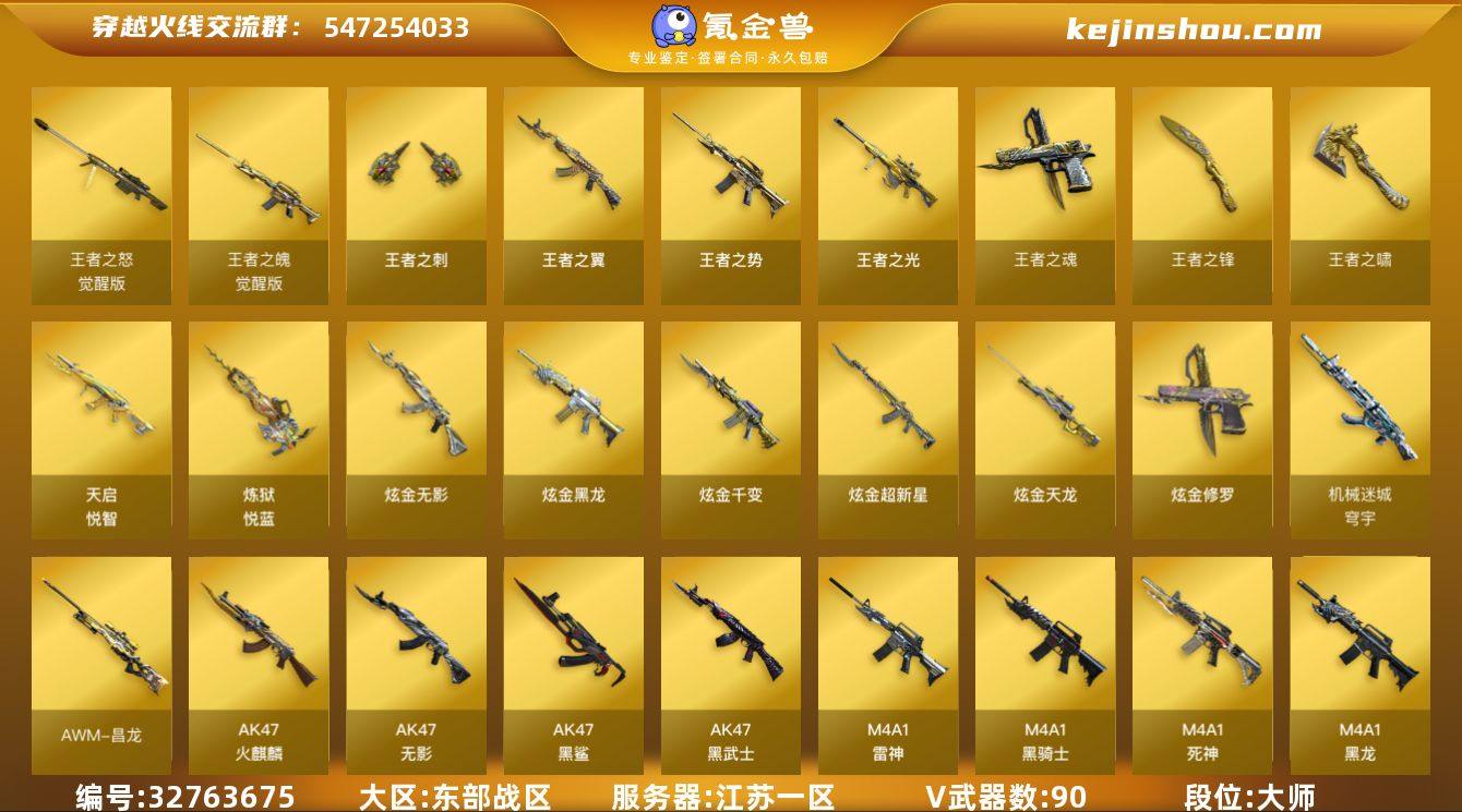 【ky6504】江苏一区-97V-12王者武器数-10炫金武器数 【传说角色】:传说星骇 【热门武器】:QBZ03-金色蔷薇*2,HK417-朱雀,M200-幻神,死亡之眼,柯尔特-冠军之特,M4A1-黑骑士,汤姆逊-烈龙*4,RPK-盘龙,加特林-炼狱*3,降世魔童,沙鹰-修罗*6,Knife-冠军之刃 【王者炫金武器】:天启-悦智,王者之翼,王者之势,王者之光,炼狱-悦蓝*2,王者之魂,王者之刺,王者之啸,王者之锋,炫金无影,炫金黑龙,炫金千变,炫金超新星*3,炫金天龙*2,炫金修罗*2 【音效卡】:M4A1-雷神音效卡,Barrett-毁灭音效卡,QBZ03-金色蔷薇音效卡,AWM-裁决音效卡 【皮肤】:QBZ03-冠军之薇,裁决-流光秘银,雷神-能量核心*2,雷神-荣耀之魄,雷神-星空,毁灭-荣耀之怒,毁灭-星空,毁灭-战神张飞,黑龙-暗月,黑骑士-冠军之势,无影-能量核心,HK417-朱雀-武当,AWM-天龙-传奇白鲨,修罗-能量核心*2,修罗-星空 【角色】:零,葵,炫,战地猎狐,堕落女神,暗夜-X,电竞少女,嘉年华灵狐,兰-海滩派对,灵狐者-X,影武者-X,潘多拉-N 【人偶武器】:AWM-灵狐-15周年嘉年华,M37-葵,COP-旗袍,降世魔童 【暴走生化】:死亡之眼,超级对讲机 【挑战大师】:激光毁灭者III,阐释者III 【英雄...