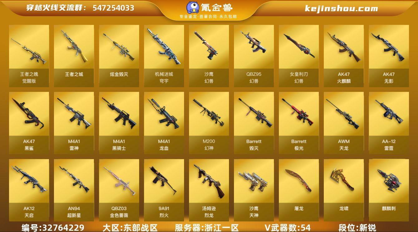 浙江一区-57V-2王者武器数-1炫金武器数 【王者炫金武器】:王者之城,炫金毁灭 【角色】:葵,樱,云海玲珑,北极狐-X,芳心审判者,娟娟,蛇姬,斯沃特-X,兔囡囡 【道具】:云山科技背包,炫彩背包,虎牙炫彩背包,绿色巨人,灵魂忍者*2,变异宝贝,迷雾幽灵*2,生化弹匣,夺命之镰,防化服*3,金色流光-枪王排位,星辰流光-枪王排位,枪王排位28赛季金色流光,枪王排位29赛季金色流光,防弹头盔*4,防弹衣*5,C4工具钳*5,手雷包*4 【音效卡】:M4A1-黑骑士音效卡 【暴走生化】:超级对讲机 【英雄级武器】:AK47-火麒麟,M4A1-雷神,M4A1-黑骑士,AK47-无影,AK12-天启,AN94-超新星*2,AK47-黑鲨,M4A1-龙血,QBZ95-幻兽,QBZ03-金色蔷薇*2,9A91-烈火,王者之魄-觉醒版,机械迷城-穹宇,AWM-天龙,Barrett-毁灭,Barrett-极光,M200-幻神,汤姆逊-烈龙*6,AA-12-雷霆,沙鹰-天神*2,破空枪刃,沙鹰-幻兽*4,屠龙,龙啸,擎天*3,麒麟刺,女皇利刃-幻兽,屠龙-云海游龙,高爆手雷-幻兽*4,闪光弹-幻兽*4,烟雾弹-幻兽*4,烟雾弹-竞技荣光 【挑战大师】:火狱乱世-超越Max,激光毁灭者III 【皮肤】:雷神-星空,毁灭-星空,无影-能量核心 【人偶武器】:M37-葵,迷你深渊...