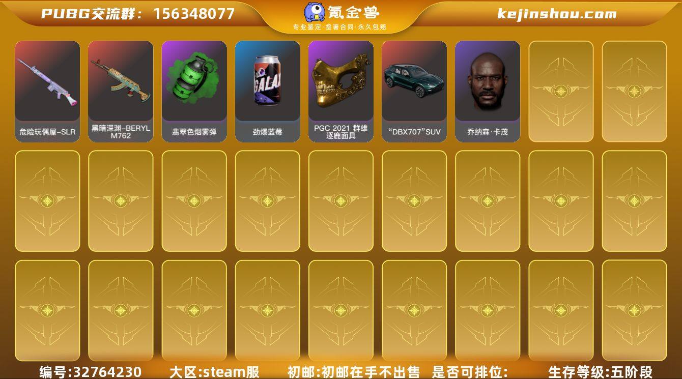 账号来源: 自营 初邮情况: 初邮在手不出售 热门装扮: 金面具,黑鬼,渔夫帽 热门载具: 阿斯顿马丁SUV 拥有成长型武器: 危险玩偶屋-SLR,黑暗深渊-BERYL M762
