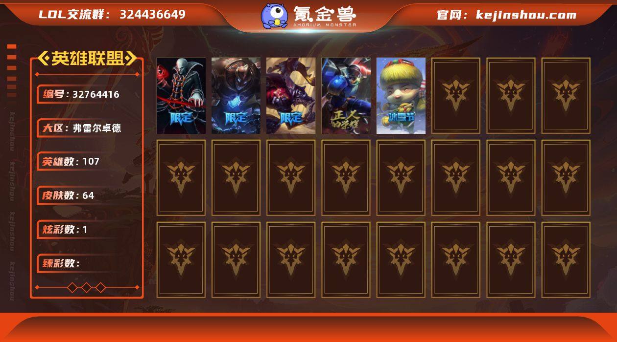 【皇冠号】未定级段位-107英雄-64皮肤-1炫彩-0终极-0神话-6限定-5传说-17史诗 【冰雪限定】:圣诞开心鬼提莫,阿木木“主人不要我了” 【限定皮肤】:诺斯费拉图弗拉基米尔,机械迷城加里奥,都铎王朝图奇,防暴天使凯尔 【传说皮肤】:地狱之门卫士加里奥,钢铁之翼凯尔,绅士科加斯,冰川巨兽墨菲特,第三类接触黑默丁格 【史诗皮肤】:摄魂男爵弗拉基米尔,天人合一易,黑帮狂花厄运小姐,炼金狂士辛吉德,战争血统蒙多,北领前线斯维因,抵抗军天使凯特琳,黑曜石守护者墨菲特,灵骨工匠奥莉安娜,V字仇杀者布兰德,地下拳王李青,钢铁烈阳蕾欧娜,腥红之月鬼武者慎,银河魔装机神菲兹,铁血帝皇德莱厄斯,西部牛仔亚索,职业杀手卢锡安 【勇士皮肤】:创意工坊黑默丁格 【典藏皮肤】:法老阿木木 【其他皮肤】:探戈灵魂崔斯特,皇家守卫赵信,末世天使凯尔,金牛座阿利斯塔,勇敢的心艾希,横行霸道图奇,重甲猎鹰艾尼维亚,战栗之毒蒙多,健美教练蒙多,海牛骑手库奇,日冕女神卡尔玛,灰胡子魔法师维迦,垃圾场特朗德尔,战场BOSS布里茨,珊瑚礁墨菲特,劫掠梦魇魔腾,烈焰古树茂凯,绿茵门神茂凯,热带丛林兰博,独眼海盗兰博,法国女仆奈德丽,美酒节特使古拉加斯,万...