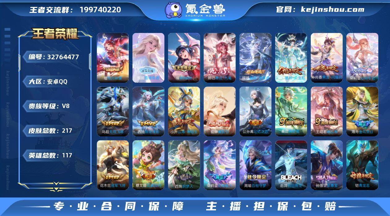 117英雄-217皮肤-安卓QQ/店长强推/质量女号/全皮朵利亚少司缘/万战金标西施/45段游走45段中路/4878星币/荣耀王者/217皮肤/117英雄/1典藏/3无双/1珍品传说/15传说/70史诗/7稀有英雄 【1 珍品传说】器灵·落星盏 嫦娥, 【1 典藏皮肤】拾光映像 瑶, 【3 无双皮肤】雪境奇遇 甄姬,真我赫兹 瑶,青丘·九尾 妲己, 【15 传说皮肤】启明星使 虞姬,花朝如约 蔡文姬,无双飞将 马超,游龙清影 西施,神骥·鸣幻洲 朵莉亚,记忆之芯 公孙离,乘龙·问璇玑 孙尚香,山海·琳琅生 小乔,冠军飞将 花木兰,金乌负日 海月,心动手记 朵莉亚,愿照·众生和 妲己,曦玄引 貂蝉,鸣野蒿 桑启,映山客 王昭君, 【70 史诗皮肤】时之奇旅 安琪拉,紫霞仙子 露娜,乘龙·忆丹青 大乔,妄想食味 姬小满,德古拉伯爵 刘邦,心灵战警 亚瑟,诗语江南 西施,无心 元歌,巫礼祀神 少司缘,鬼剑武藏 宫本武藏,百相守梦 黄忠,幻珠鲛人 朵莉亚,星夜王子 白起,寅虎·心曲 杨玉环,至美·乘鲤谣 西施,无限星赏官 公孙离,线条小狗 周瑜,百晓客 明世隐,魅力维加斯 妲己,如梦令 嫦娥,偶像歌手 王昭君,荣光圣徽 蒙恬,女仆咖啡 妲己,白蛇 大乔,九幽镇关 项羽,遇见神鹿 瑶,舞动绿茵 蔡文姬,暗夜贵公子 嬴政,鹰眼统帅 狄仁杰,金属风暴 墨子,原初追逐者...