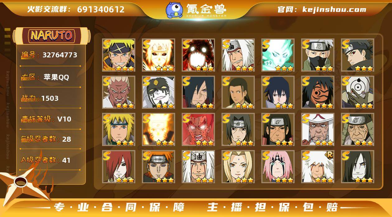 V10 1503万战力 28S-41A 金币1.24万 有熊猫 十尾带土57片 秽土鼬50片 三代目风影56片 TT1795 【S级忍者】:长门「秽土转生」(3星),猿飞日斩「秽土转生」(3星),千手柱间「秽土转生」(3星),宇智波斑「秽土转生·解」(3星),春野樱「忍界大战」(3星),艾「忍界大战」(3星),宇智波鼬「须佐能乎」(3星),宇智波止水「须佐能乎」(3星),旗木卡卡西「须佐能乎」(3星),千手柱间「木叶创立」(3星),自来也(3星),自来也「舞之豪杰」(3星),大蛇丸(3星),自来也「传说中的三忍」(3星),纲手(3星),猿飞日斩(3星),波风水门(3星),神秘面具男「红夜之刃」(3星),漩涡鸣人「九喇嘛连结」(3星),迈特凯「死门」(3星),佩恩「天道」(3星),宇智波佐助「永恒万花筒」(3星),宇智波斑 「白面具」(3星宇智波斑「白面具」),大筒木桃式(3星),大筒木舍人「最终章」(3星),漩涡鸣人「暴怒·第六尾」(3星),波风水门「九喇嘛连结」(3星),漩涡鸣人·宇智波佐助(3星) 【A级忍者】:艾「青年」(2星),长门「青年」(2星),波风水门「青年」(2星),迪达拉(2星),迪达拉「秽土转生」(2星),奇拉比「忍界大战」(2星),飞段(3星),飞段「死司凭血」(2星),干柿鬼鲛(5星),漩涡博人「桃式显现」(2星),漩...