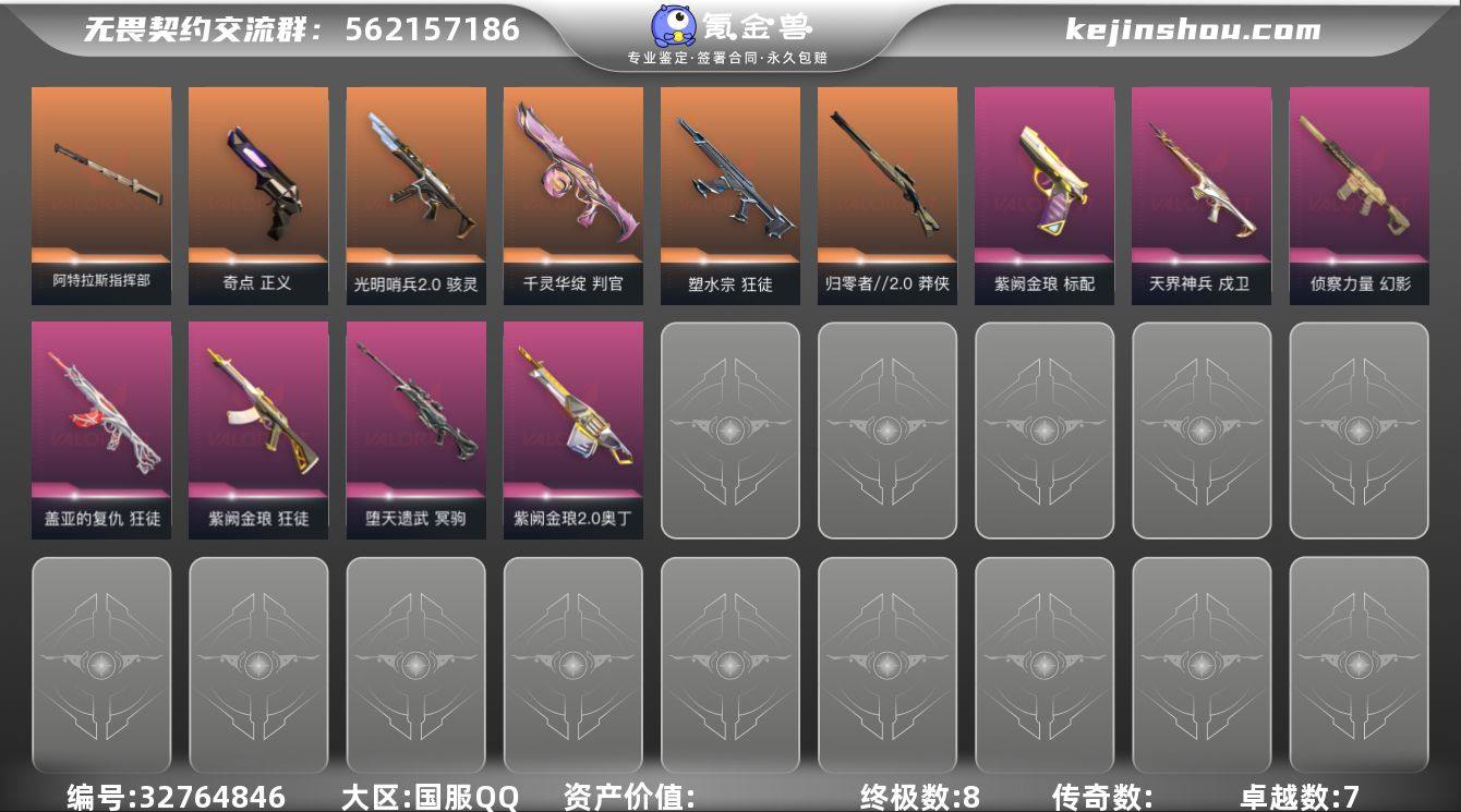 【英雄】:幻棱,炼狱,暮蝶,壹决,捷风,雷兹,幽影,不死鸟,贤者,猎枭,蝰蛇,零,芮娜,奇乐,尚勃勒,霓虹,夜露,星礈,K/O,盖可,黑梦 【近战武器】:近战武器-天玄刀,近战武器-阿特拉斯指挥部 甩棍 【狂徒】:狂徒-塑水宗,狂徒-盖亚的复仇,狂徒-紫阙金琅 【幻影】:幻影-侦察力量 【戍卫】:戍卫-天界神兵 【冥驹】:冥驹-堕天遗武 【莽侠】:莽侠-归零者//2.0 【奥丁】:奥丁-紫阙金琅//2.0 【判官】:判官-千灵华绽 【骇灵】:骇灵-光明哨兵//2.0,骇灵-无限竞技 【标配】:标配-紫阙金琅 【正义】:正义-奇点 【卡面】:热舞环节 卡面,至黑之夜 卡面,红鳞松叶 卡面,Clutch 卡面,无畏契约:蝰蛇 卡面,无畏契约GO!第一卷:芮娜 卡面,无畏契约GO!第一卷:零 卡面,《双城之战》金克丝 卡面,代号红色 卡面,新兵报到 卡面,V契约 卡面,无畏契约 卡面 【喷漆】:蝰蛇 喷漆,致命毒素 喷漆,喜欢哪种毒? 喷漆,买装还是存钱 喷漆,酷熊冲浪 喷漆,无畏契约GO!第一卷:零 喷漆,无畏契约GO!第一卷:捷风 喷漆,无畏契约GO!第一卷:贤者 喷漆,无畏契约GO!第一卷:奇乐 喷漆,胜利属于无畏契约 喷漆,GLHF 喷漆,无畏契约 喷漆 【挂饰】:薰衣草之心...