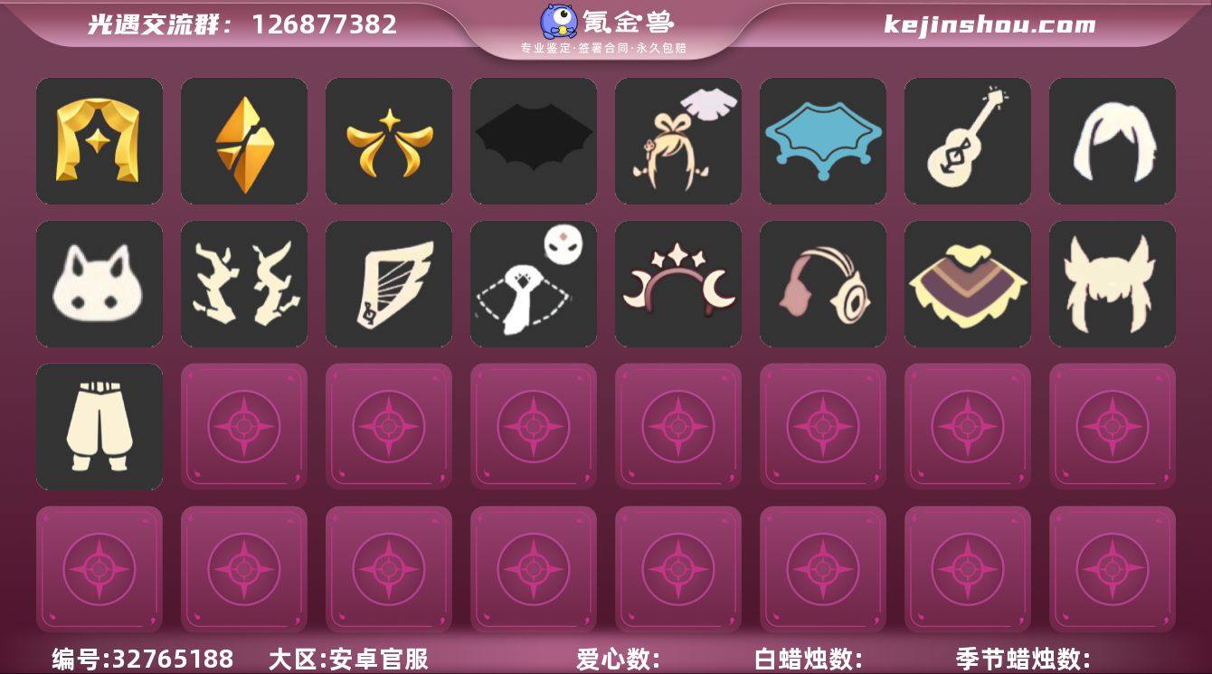 账号类型: 手机账号 季节已毕业: 表演季,破晓季,欧若拉季 完成地图: 全图毕业 珍稀物品: 白枭,透明蝶翼斗 礼包: 蝙蝠套,绊爱,瑞雪,吉他,奔跑发型,兔子,枯角,竖琴,猫套,星月头饰,彩虹耳机,雪怪斗 裤子: 武士裤 发型: 白枭