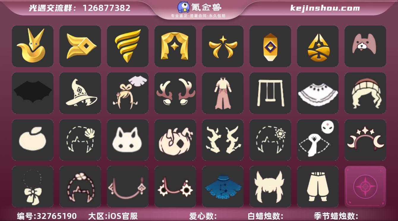 账号类型: 手机账号 季节已毕业: 小王子季,风行季,潜海季,表演季,欧若拉季,追忆季,归巢季 完成地图: 雨林,霞谷,暮土 珍稀物品: 白枭,透明蝶翼斗,玫瑰花 礼包: 蝙蝠套,巫师,绊爱,鹿角,牛仔裤,秋千,白绒金,彩虹帽,橘子,贝壳,兔子,南瓜,枯角,雪花,猫套,星月头饰,蝴蝶结,四叶草,新年耳钉,日光耳环,线框斗,小狗周年发饰 裤子: 武士裤 发型: 白枭
