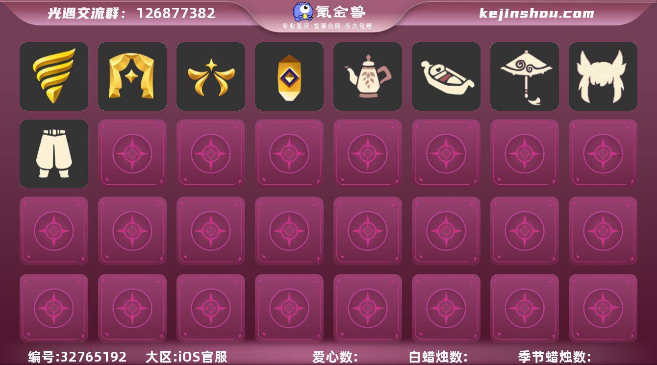账号类型: 手机账号 季节已毕业: 潜海季,表演季,欧若拉季,追忆季 完成地图: 霞谷 珍稀物品: 白枭,透明蝶翼斗 礼包: 茶壶,小船,红伞 裤子: 武士裤 发型: 白枭