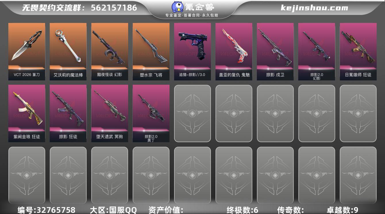 【943033】【套装】:VCT 2026 赛季套装,回火礼包:掠影套装,掠影//3.0套装 【英雄】:幻棱,炼狱,暮蝶,壹决,捷风,不死鸟,贤者,猎枭,芮娜,黑梦 【近战武器】:近战武器-VCT 2026 篆刀,近战武器-影蝶,近战武器-艾沃莉的魔法棒 【狂徒】:狂徒-掠影,狂徒-日冕雄师,狂徒-紫阙金琅 【幻影】:幻影-黯夜怪谈,幻影-掠影//2.0 【戍卫】:戍卫-掠影 【冥驹】:冥驹-堕天遗武 【飞将】:飞将-塑水宗 【奥丁】:奥丁-掠影//2.0 【追猎】:追猎-掠影//3.0 【鬼魅】:鬼魅-盖亚的复仇 【卡面】:树懒大作战 卡面,代号红色 卡面,新兵报到 卡面,V契约 卡面,无畏契约 卡面 【喷漆】:伤心心 喷漆,胜利属于无畏契约 喷漆,GLHF 喷漆,无畏契约 喷漆 【挂饰】:薰衣草之心 挂饰,天外飞客 挂饰,无畏契约 纪念币 挂饰