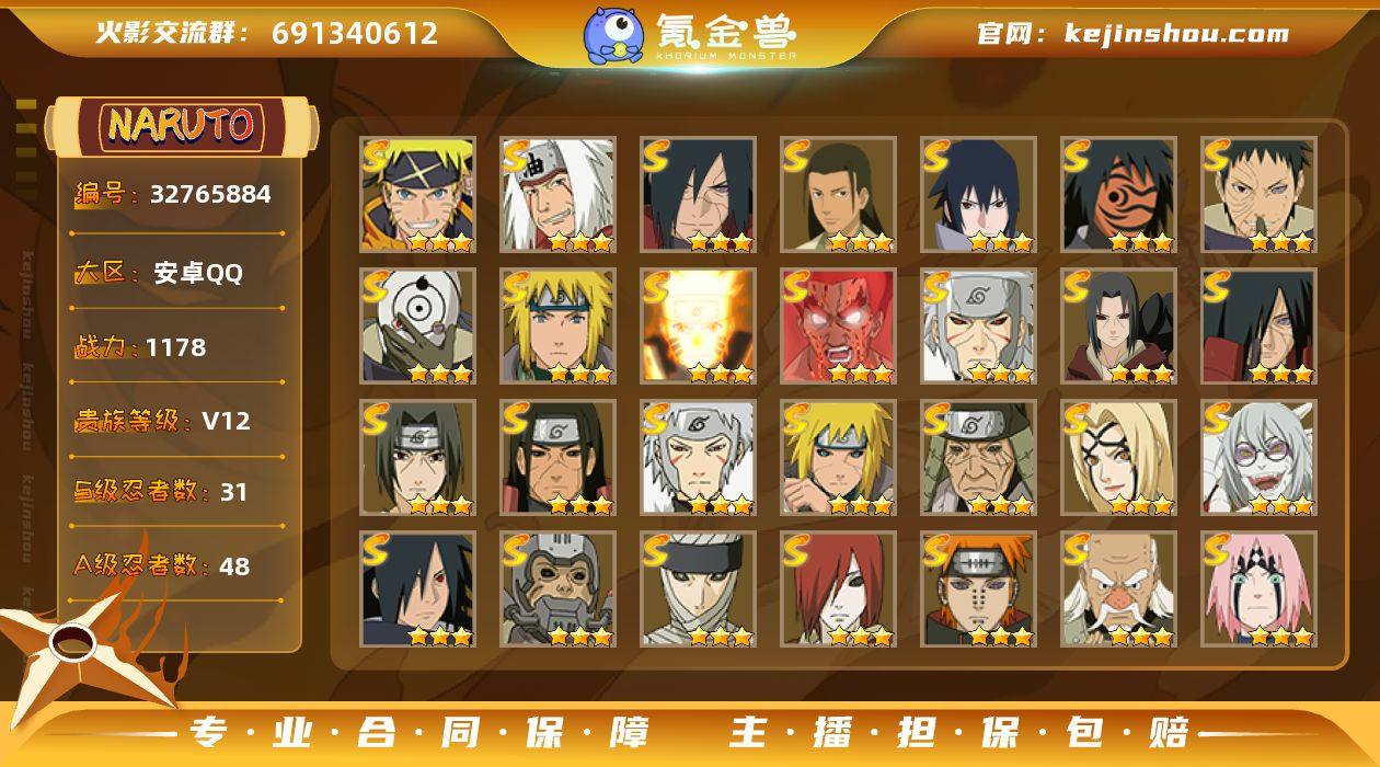 0BBEX7 号 VIP12,1178W战力,S忍33个,A忍55个,本服前500,战区未上榜,通灵兽22个,6时装,点券1185,金币28123,高招券87,影级1阶,忍者星数699