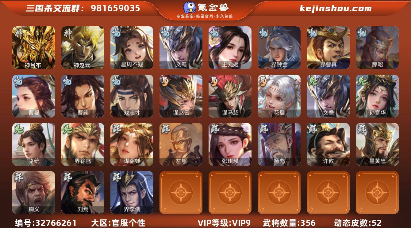 【1293】官阶:大将军;VIP等级:VIP9;史诗武将数量:28;动态皮肤数量:52;武将总数:356;史诗宝珠数量:0;将魂数量:2790;神将:4;魏国史诗武将:16;蜀国史诗武将:3;吴国史诗武将:3;群史诗武将:12