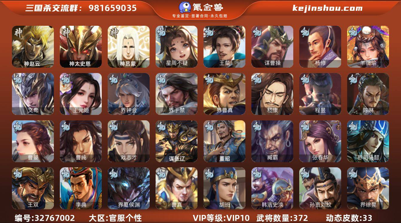 官阶:大将军;VIP等级:VIP10;史诗武将数量:46;动态皮肤数量:33;武将总数:372;史诗宝珠数量:0;将魂数量:1141;神将:2;魏国史诗武将:20;蜀国史诗武将:10;吴国史诗武将:5;群史诗武将:16
