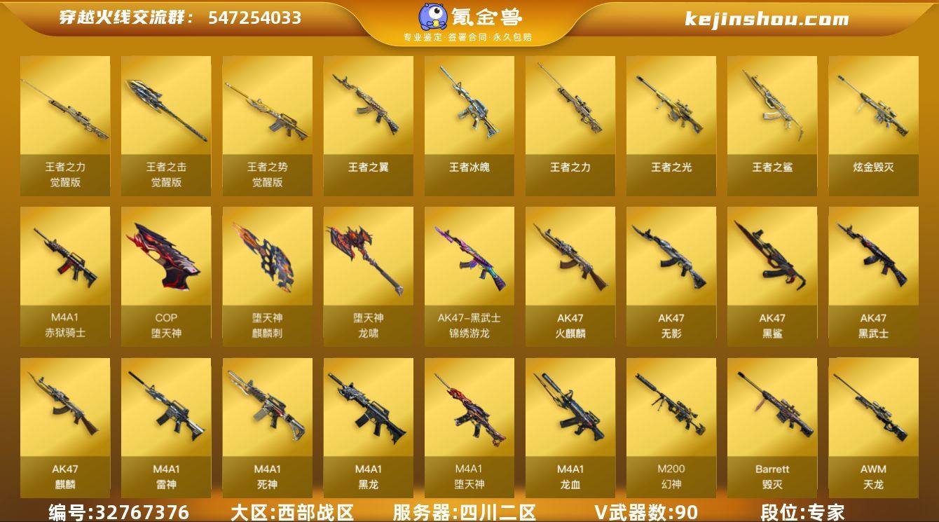 【943056】四川二区-98V-10王者武器数-1炫金武器数 【热门武器】:M200-幻神,死亡之眼*3,汤姆逊-烈龙*6,加特林-炼狱*2,斯泰尔-蝴蝶,COP-堕天神,沙鹰-修罗*2,黄金猫猫手套-白鲨 【王者炫金武器】:王者冰魄,王者之鲨,王者之翼*2,王者之光,王者之力,炫金毁灭 【音效卡】:AK47-火麒麟音效卡,Barrett-毁灭音效卡 【皮肤】:幻神-星耀 皮肤,幻神-传奇欧欧 皮肤,QBZ03-传奇宠儿,裁决-羽掣 皮肤,雷神-暗月,雷神-荣耀之魄,雷神-星空,火麒麟-冠军之心,毁灭-荣耀之怒,毁灭耀金皮肤,黑龙-能量核心,M4A1-黑龙-361,战神-粉色甜心皮肤,战神-紫绶金章皮肤*3,战神-流金岁月皮肤*3,天龙-能量核心,AWM-天龙-传奇70KG,屠龙-星耀 皮肤,屠龙-春桃 皮肤,屠龙-破浪逐光 皮肤 【角色】:葵,迷迭香,星际战将,王者零-华冠丽服,王者-零,空,嘉年华灵狐,潜龙队-X,维纳斯 【人偶武器】:斯泰尔-蝴蝶,巴雷特-零-水下丽影,AWM-灵狐-15周年嘉年华,M37-葵,COP-旗袍,迷你深渊冰龙,夺魂,迷你生化手雷,生化手雷-机甲核心,闪光弹-小乔 【暴走生化】:死亡之眼*3 【挑战大师】:神圣爆裂者III,AK47-冰龙粉碎者,冰龙粉碎者-白马银枪,激光毁灭者III,阐释者III 【...