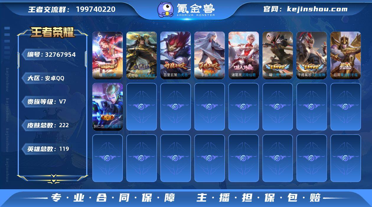 119英雄-222皮肤-安卓QQ/V7/打野射手号/永恒钻石/222皮肤/119英雄/1典藏/11传说/66史诗 【1 典藏皮肤】拾光映像 瑶, 【9 传说皮肤】白虎志 百里玄策,死亡执政官 大司命,云鹰飞将 曜,凤求凰 李白,武陵仙君 诸葛亮,黄金射手座 后羿,久胜战神 干将莫邪,超时空战士 狄仁杰,神树通天 后羿, 营地ID:0
