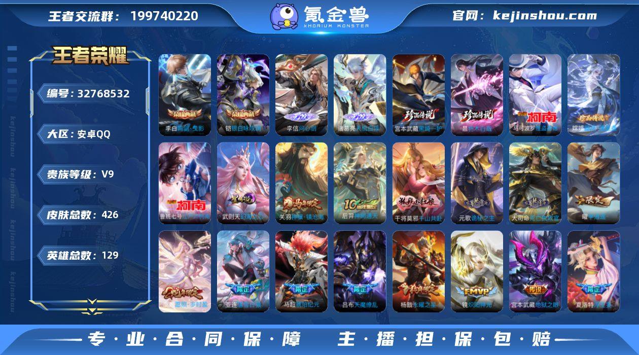 可换绑【多限定极品v9·2无双李信曜·5珍品怪盗基德柯南·2典藏铠李白·琥珀纪元·李逍遥·天魔缭乱·狗年杨戬·神威·无二次包过】 17按键 1天幕,1星传说,20王者印记,满级铭文 无二次包过CD19064 安卓Q-V9-426皮肤-2典藏皮肤-1典藏英雄-2无双-5珍品传说-24传说-128史诗【英雄全皮】:刘禅全皮,元歌全皮,刘邦全皮,孙权全皮,鬼谷子全皮,敖隐全皮,蒙恬全皮,桑启全皮,夏洛特全皮,空空儿全皮,影全皮,海诺全皮,少司缘全皮【荣耀典藏】:武则天英雄,李白鸣剑曳影,铠银白咏叹调【无双皮肤】:李信问心剑,诸葛亮天机白泽【珍品传说】:宫本武藏黑崎一护,暃朽木白哉,嫦娥器灵落星盏,鲁班七号江户川柯南,马可波罗怪盗基德【星元皮肤】:武则天幻海之心【天幕】:铃舟系梦天幕【传说皮肤】:关羽神骥镇沧海,后羿神树通天,干将莫邪千山共赴,元歌诡秘之主,大司命死亡执政官,虞姬愿照岁时盈,云缨幻光神枪,桑启鸣野蒿,亚连落雪白狼,吕布曦玄引,马超琥珀纪元,东皇太一灼幽烈阳,夏洛特浮生妄,曜李逍遥 ,镜炽阳神光,虞姬启明星使,曜云鹰飞将,张良黄金白羊座,达摩黄金狮子座,杨戬永曜之星,宫本武藏地狱之眼,孙悟空地狱火,吕布天魔缭乱,武则天海洋之心【限定...