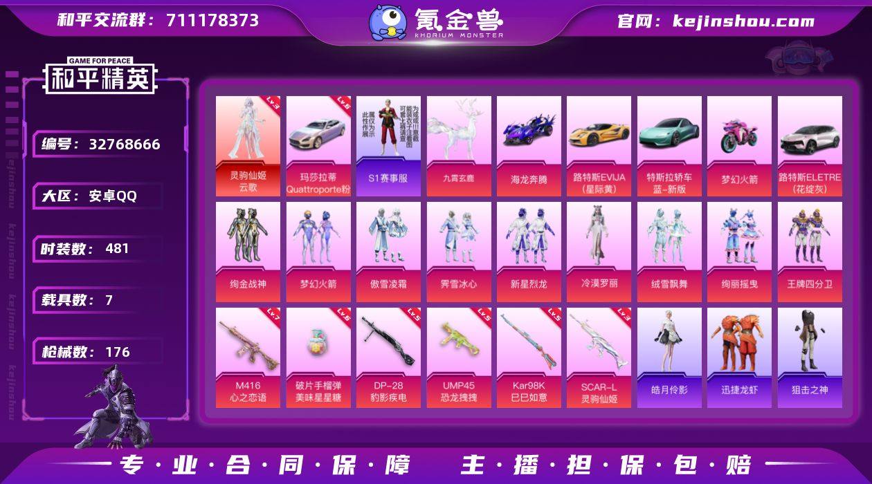 有s1上衣,一个红装云歌3级了,还有火箭少女头,王牌4分卫,还有绚金战神、新星烈龙一个玛莎拉蒂6级车手雷升到了6级
