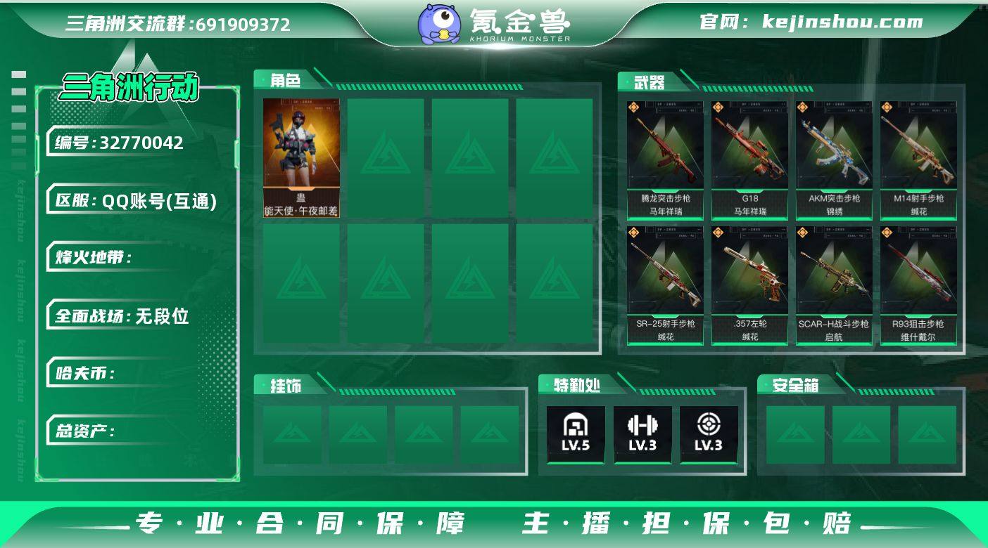 【总资产48.43M 哈弗币14415924 干员外观1个 烽火36级 铂金】1400万纯币 蛊-能天使·午夜邮差 M4A1突击步枪-阿米娅,AKM突击步枪-锦绣,SCAR-H战斗步枪-启航,腾龙突击步枪-马年祥瑞,Vector冲锋枪-能天使·午夜邮差,勇士冲锋枪-能天使·午夜邮差,M14射手步枪-缄花,SR-25射手步枪-缄花,R93狙击步枪-维什戴尔,.357左轮-缄花,G18-马年祥瑞,复合弓-黑·天际线 QBZ95-1突击步枪-曙光,K416突击步枪-冬日风情,SG552突击步枪-哈夫克警备,SCAR-H战斗步枪-囚徒,MP5冲锋枪-战术竞备,勇士冲锋枪-深海恐惧,MP7冲锋枪-六套之力,M250通用机枪-囚徒,QJB201轻机枪-炽焰,M700狙击步枪-哈夫克警备 M1A4坦克-护林人,轮式突击炮-护林人,M1A4坦克-烟火2026,GTQ35坦克-烟火2026,突击车-寒梅,轮式突击炮-烟火2026,轮式突击炮-巅峰竞赛,M1A4坦克-巅峰竞赛,轮式突击炮-荣耀,F-45A战斗机-夜间迷彩,侦察直升机-烟火2026,F-45A战斗机-建造,侦察直升机-酒红,突击直升机-原始伪装,编号:ZPDPF19