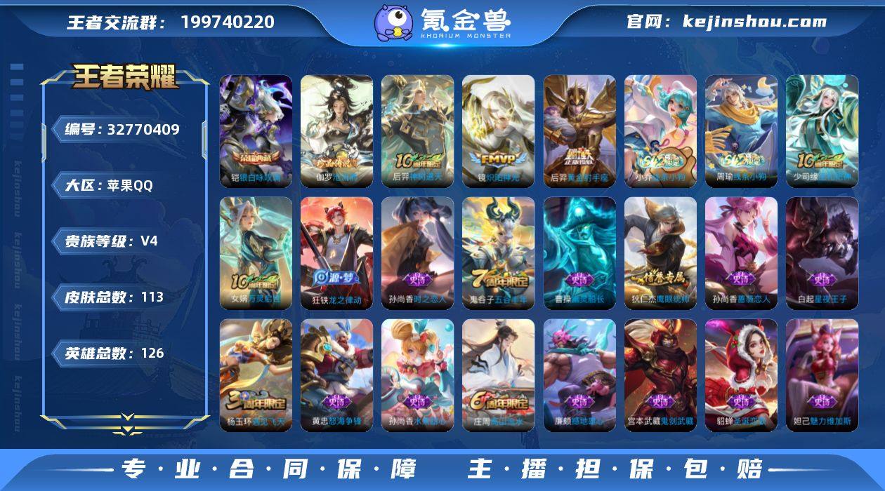 无二次--苹果Q-V4-最强王者段位-126英雄-113皮肤-1典藏皮肤-1珍品传说-3传说-18史诗HZ2632703 【荣耀典藏】:铠银白咏叹调 【珍品传说】:伽罗沧流箭 【传说皮肤】:后羿神树通天,镜炽阳神光,后羿黄金射手座 【限定皮肤】:白起狰,狄仁杰阴阳师,虞姬凯尔特女王,孙尚香蔷薇恋人,庄周高山流水,孙膑妖精王,扁鹊炼金王,芈月重明,夏侯惇朔风刀,曹操烛龙,典韦穷奇,狄仁杰万华元夜,达摩沙漠行僧,项羽海滩派对,老夫子醍醐杖,程咬金演武夺筹,兰陵王金庭之子,李元芳云中旅人,钟馗驱傩正仪,杨玉环遇见飞天,太乙真人饕餮,鬼谷子原初探秘者,鬼谷子五谷丰年,苏烈千军破阵,弈星混沌棋,沈梦溪大漠名商,明世隐疑决卦,裴擒虎擒涛扼浪,狂铁御狮,桑启海盐诗旅,张良古海寻踪,鬼谷子天穹祈灯,刘邦剑破天穹,刘备异域游侠 【赛季限定】:孙膑妖精王,扁鹊炼金王,虞姬凯尔特女王,白起狰,太乙真人饕餮,曹操烛龙,芈月重明,典韦穷奇,狂铁御狮,夏侯惇朔风刀,弈星混沌棋,明世隐疑决卦,老夫子醍醐杖,鬼谷子原初探秘者,狄仁杰万华元夜,程咬金演武夺筹,钟馗驱傩正仪,苏烈千军破阵,达摩沙漠行僧,兰陵王金庭之子,沈梦溪大漠名商,李元芳云中旅人,桑启海盐...