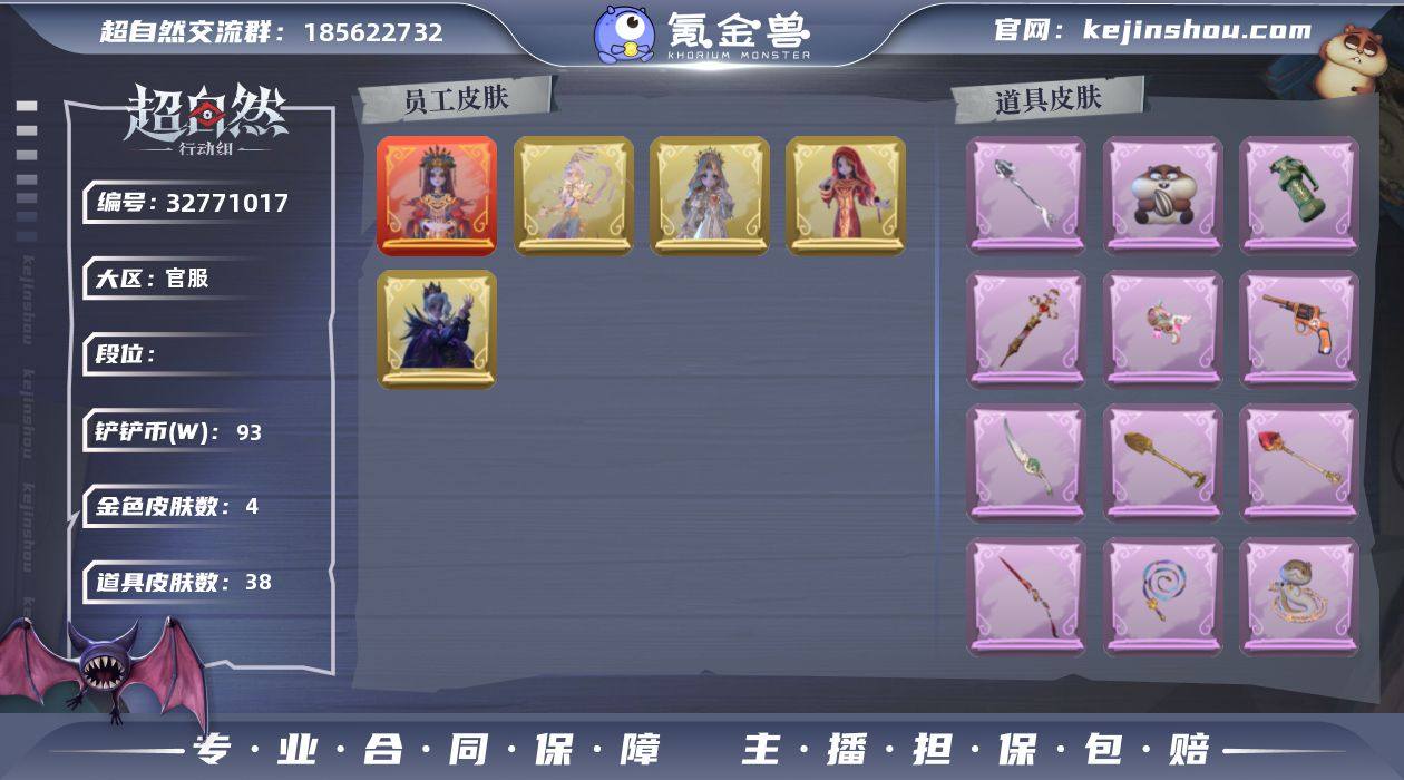 ZR479 王牌 红色皮肤数量:1 粉色皮肤数量:0 金色皮肤数量:4 紫色皮肤数量:10 道具皮肤数量:38 铲铲币:930000 铲铲币(单位W):93 外观:巫铃儿 镜生遗梦 零 渡鸦公爵 逍遥 莲华渡 薇薇安 圣光之谕 巫铃儿 镜花辞 道具:音响 鸣沙鼓 急救包 末章心跳 腰包 宝剑八 急救包 土拨鼠捏捏 转轮手枪 新星时代 急救包 蔷薇物语 闪光弹 金戈玄铜 传送按钮 昆仑镜 铲子 撒拉弗的祷告 长鞭 飞天绫 专业手电 云端梦想计划 额外的背包 飞花令 夜视仪 金丝眼镜 铲子 圣心之泪 铲子 龙鳞 桃木剑 凤鸣九天 音响 happy猫 传送按钮 逆时审判 长鞭 小狗蛇点点鞭 电击枪 甜蜜泡泡枪 摸金符 祝祷词 短管猎枪 赞萌露比水枪 腰包 月下莲台 刺刀 碧络琅环 喷气背包 乘风溯雪 摸金符 紫霄 葫芦 伏妖塔 黄牛能量饮料 青玉抱丹 腰包 惊魂娃娃 背饰 子夜证词 背饰 梵音莲华 背饰 天使的呼唤 背饰 蝶恋花 背饰 小小情公主 美妆:暗夜小恶魔 载具:惊奇万圣涂装 头饰:烛光纪念 太空鲨头套 雪墩墩头套 蒜了八 樱桃奶油布丁 惊魂南瓜头套 精致露比头套 鱼头怪头套 烈焰红唇头套 大葱明头套 火爆了头套 面具马头套 哈士奇头套 萨卡班甲鱼头套 嘻嘻头套 滑稽头套 呆滞头套 卑微头套 小狗蛇点点头套 像素朋...