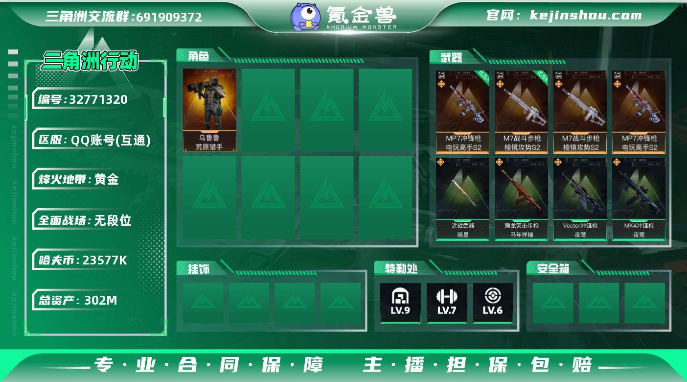 302m总资产-23577k哈夫币-60烽火等级-黄金-1战场等级-无军衔 【干员外观】:乌鲁鲁-荒原猎手,蛊-不羁人生 【近战皮肤】:近战-暗星,近战-黑鹰 【典藏外观】:M7战斗步枪-棱镜攻势S2,MP7冲锋枪-电玩高手S2 【典藏外观成色】:M7战斗步枪-棱镜攻势S2(优品B),MP7冲锋枪-电玩高手S2(优品A) 【传说外观】:K416突击步枪-行动记录,SG552突击步枪-点翠,SCAR-H战斗步枪-荼蘼,腾龙突击步枪-马年祥瑞,腾龙突击步枪-万金泪冠,KC17突击步枪-点翠,MK47突击步枪-暗星,Vector冲锋枪-夜莺,SR-3M紧凑突击步枪-暗星,SR-3M紧凑突击步枪-荼蘼,勇士冲锋枪-万金泪冠,MK4冲锋枪-夜莺,PKM通用机枪-荼蘼,Mini-14射手步枪-夜莺,M14射手步枪-蛮荒,PSG-1射手步枪-点翠,AWM狙击步枪-万金泪冠,G18-马年祥瑞 【史诗外观】:K416突击步枪-腊梅,腾龙突击步枪-猎鳄行动,K437突击步枪-丛影谍踪,MP5冲锋枪-深海恐惧,SR-3M紧凑突击步枪-开工大吉,勇士冲锋枪-丛影谍踪,MP7冲锋枪-六套之力,M249轻机枪-丛影谍踪,M250通用机枪-囚徒,VSS射手步枪-丛影谍踪, M14射手步枪-航天庆典 【稀有外观】:SG552突击步枪-马年新春,SG552突击步枪-贴花艺术, AK-12突击步枪-马年新春,SCAR-H战斗步...