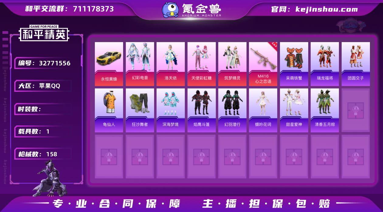 XS11491【可二次】苹果手Q-1载具-5粉装-3特效枪-107套装-158枪皮-9王牌印记-超级王牌-50795热力值【1载具】永恒黄蜂【5粉装】天使彩虹糖,角色-圣堂之誓,筑梦精灵,幻彩电音,角色-洛天依【3特效枪】Mk14-福马献瑞[5级],ACE32-萌骑漫游[5级],M416-心之恋语[7级]【2稀有】狂沙舞者,汤姆逊-奇异狩猎者【6飞行器】拳皇97滑翔尾迹,光之冒险尾迹,空岛之星尾迹,霓虹漫游飞行器,变形金刚飞行器,炫彩糖果飞行器【255其它衣服和枪皮】格斗先锋,虚音幻奏,红釉青花,萌趣咩咩,海盐绵绵冰,冰川特警,吉莉礼服,娇憨猪猪,马上来财,灼焰舞者,冰冻风暴,萌趣颜团子,麻辣教官,龟仙人,SS26特训,SS21特训,极速光影,滨海假日,虎虎生威吉莉,炫彩糖果,SS22特训,竞技名士,SS19特训,战术大师,狙击之神,极速竞梦,龙的传人,玉兔迎春,幽夜迷踪,空投萌叽,千禧之恋,幻羽潜行,角色-军刀雅典娜,团圆交子,本愿之火,长空猛禽,爱神,角色-罗莉,角色-蝶吟花词,SS34特训,湖蓝色名流,完美偶像,酸甜橘柚,青翼流星,SS28特训,SS37特训,龙腾端午,角色-霜刃之御,福马献瑞,极乐追光,焰鹰斗篷,SS18特训,飞驰魅影,海上生明月,清香五月粽,SS20特训,炫蓝之夏,雨过天青,SS35特训,晨曦薄雾,青春冒险家,时空追击者,绮丽涂鸦,甜心亚梦,魅...