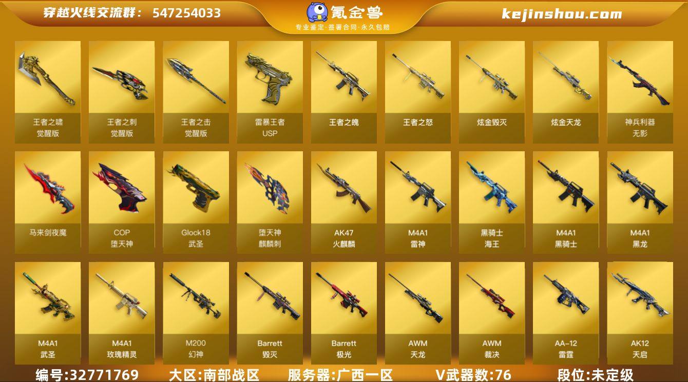 广西一区-86V-16王者武器数-4炫金武器数 【热门武器】:QBZ03-金色蔷薇,Scar Light-白虎,HK417-朱雀,M4A1-青龙,M200-幻神,死亡之眼,荣耀世冠-雷神,柯尔特-冠军之特,M4A1-黑骑士*3,汤姆逊-烈龙*4,RPK-盘龙,加特林-炼狱*4,降世魔童,COP-堕天神,沙鹰-修罗*2 【王者炫金武器】:王者之魄,王者之怒*2,USP-雷暴王者,炫金骑士,炫金毁灭,炫金天龙*2 【音效卡】:M4A1-雷神音效卡,M4A1-黑龙音效卡,M4A1-黑骑士音效卡,Barrett-毁灭音效卡,Barrett-极光音效卡 【皮肤】:幻神-KZ-CFPLS25冠军 皮肤,白虎-巅峰荣耀 皮肤,白虎-量子聚变 皮肤,QBZ03-冠军之薇,QBZ03-巅峰荣耀皮肤,AWM-裁决-百城联赛天津皮肤,星神-拼搏 皮肤,汤姆逊-烈龙-末日皮肤,雷神-暗月,火麒麟-雷神,火麒麟-冠军之心,火麒麟-平天大圣,火麒麟-心动糖果,毁灭-星空,毁灭-冠军之怒,毁灭-CFS2020,毁灭-黑大圣皮肤,毁灭-航天科技皮肤,黑龙-能量核心,黑龙-暗月,M4A1-黑龙-361,黑骑士-冠军之势,战神-粉色甜心皮肤,战神-紫绶金章皮肤,战神-流金岁月皮肤,AK47-B-常胜将军-刘备*2,AK47-B-常胜将军-孙权,极光-能量核心,屠龙-春桃 皮肤,擎天-秘银 【角色】:葵,王者-瞳-闭月羞花...