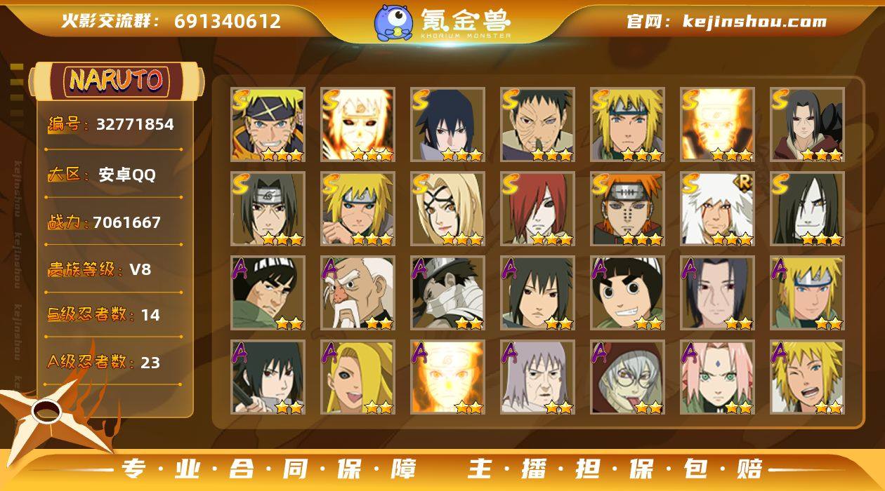 14S忍/23A忍/战力706W/V8/区服1004 【S忍者】 宇智波佐助「漩涡鸣人」,宇智波佐助「永恒万花筒」,漩涡鸣人「九喇嘛连结」,宇智波带土「忍界大战」,自来也「舞之豪杰」,宇智波鼬「秽土转生」,纲手「百豪」,波风水门「秽土转生」,长门「秽土转生」,宇智波鼬「须佐能乎」,佩恩「天道」,波风水门,大蛇丸,波风水门「九喇嘛连结」, 【A忍者】 波风水门「新春限定」,大野木「侠隐江湖」,迈特凯「青春爆炸」,宇智波鼬「夏日限定」,李洛克「忍界大战」,宇智波泉奈,桃地再不斩「秽土转生」,波风水门「青年」,宇智波佐助「须佐能乎」,迪达拉「秽土转生」,漩涡鸣人「九尾查克拉」,千代「近松十人卫」,药师兜「半蛇斗篷」,春野樱「百豪」,宇智波佐助「万花筒写轮眼」,飞段「死司凭血」,飞段,我爱罗「疾风传」,蝎,干柿鬼鲛,宇智波鼬,猿飞阿斯玛,迈特凯, PX_2525927