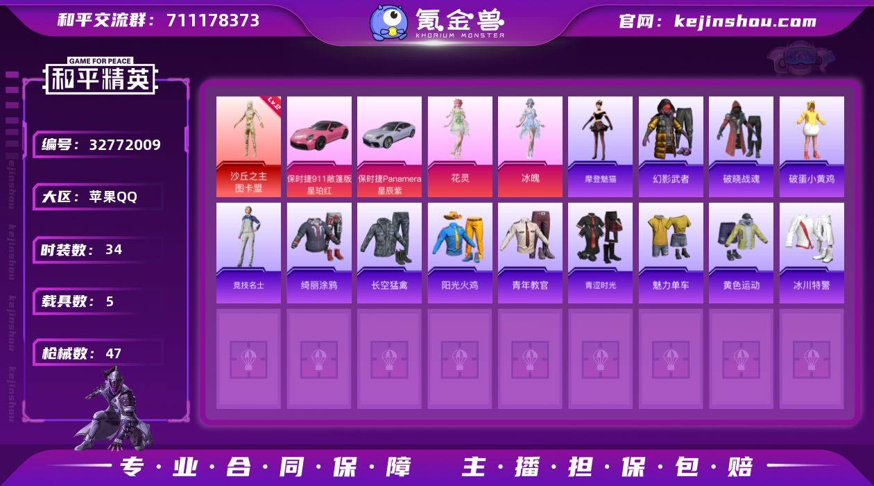 【特价出售/店主推荐】苹果 手Q-1神装-4粉装-2特效枪-5载具-4粉色飞行器-19922热力值-2王牌印记-34套装-47枪皮 【红色神装等级】:沙丘之主-图卡盟(二级) 【红色角色神装】:沙丘之主-图卡盟 【粉色套装】:角色-花灵,角色-冰魄,粉装-光之祷告,角色-月中灵 【粉色枪皮等级】:Mk14-福马献瑞(五级),信号枪-金乌曜日(二级) 【粉色载具】:法拉利LaFerrari(赛车红),法拉利Purosangue(纽博格林银),保时捷911 敞篷版(星珀红),保时捷Panamera(星辰紫),九霄玄鹿 【粉色枪皮】:Mk14-福马献瑞,信号枪-金乌曜日 【粉色飞行器】:香车宝马飞行器,沙丘之主天马,云梦轻舟飞行器 【粉色降落伞】:幻影战神降落伞,沙丘之主降落伞,灵驹仙姬降落伞,虹云熊熊降落伞,霜月狼主降落伞,鸢尾珑雾降落伞 【稀有套装】:套装-雪国风尚,角色-奈斯,套装-马上有钱,套装-暮夜私语,套装-迅捷龙虾,角色-摩登魅猫,角色-云韶流音,套装-粉彩缠枝,套装-雨过天青,套装-红釉青花,角色-霜纹水星 【稀有枪皮】:AKM-缤纷海域,AKM-龙的传人,SCAR-L-夜灯,M416-红色方程式,G36C-灵驹仙姬,UMP45-夜灯,汤姆逊-樱桃泡泡,汤姆逊-像素花束,P90-绯影武装,AWM-暮色玫影,SVD-绯影武...