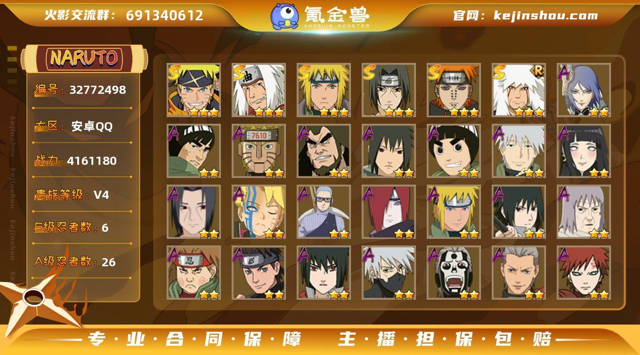 6S忍/26A忍/战力416W/V4/区服3174 【S忍者】 宇智波佐助「漩涡鸣人」,自来也「舞之豪杰」,自来也「传说中的三忍」,宇智波鼬「须佐能乎」,佩恩「天道」,波风水门, 【A忍者】 小南「神驹佑将」,机械鸣人「初始形态」,迈特凯「青春爆炸」,长十郎「六代目水影」,漩涡博人「桃式显现」,宇智波鼬「夏日限定」,日向雏田「最终章」,旗木卡卡西「幻之真容」,李洛克「忍界大战」,宇智波泉奈,神农「羁绊」,长门「青年」,波风水门「青年」,宇智波佐助「须佐能乎」,千代「近松十人卫」,秋道丁次「忍界大战」,猿飞日斩「火影继承人」,宇智波佐助「万花筒写轮眼」,旗木卡卡西「万花筒写轮眼」,飞段「死司凭血」,飞段,我爱罗「疾风传」,蝎,干柿鬼鲛,宇智波鼬,猿飞阿斯玛, PX_2528603