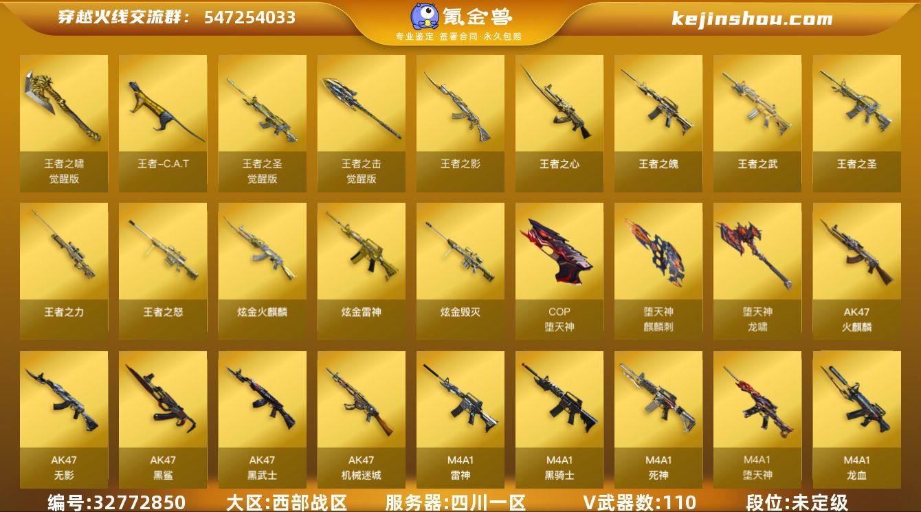 四川一区-121V-19王者武器数-3炫金武器数 【热门武器】:QBZ03-金色蔷薇*3,M200-幻神,金色小号,C.A.T,M4A1-黑骑士*7,汤姆逊-烈龙*6,RPK-盘龙*6,加特林-炼狱,火麒麟-绝迹,COP-堕天神,沙鹰-修罗*4 【王者炫金武器】:王者之圣,王者之武,王者之影,王者之魄,王者之心,王者之怒*3,王者之力,炫金火麒麟,炫金雷神,炫金毁灭 【音效卡】:AK47-火麒麟音效卡,Barrett-毁灭音效卡 【皮肤】:烈龙-星空,雷神-荣耀之魄,雷神-星空,火麒麟-轻羽皮肤,毁灭耀金皮肤,毁灭-AG-CFPLS15冠军,黑骑士-暗月,无影-能量核心,战神-粉色甜心皮肤,战神-紫绶金章皮肤,战神-流金岁月皮肤,AWM-天龙-传奇70KG,极光-能量核心,修罗-能量核心,修罗耀金皮肤 【角色】:迷迭香,王者-葵-貂蝉,空,娟娟,零-水下丽影,灵狐者-X,灵狐者-黄金海岸,潘多拉-X,潜龙队-X,樱-缤纷夏日 【人偶武器】:火麒麟-绝迹,火麒麟-灵狐*2,巴雷特-零-水下丽影,M37-葵,C.A.T,迷你牛魔王,闪光弹-小乔 【英雄级武器】:AK47-火麒麟*4,M4A1-雷神*2,M4A1-黑骑士*7,AK47-无影,M4A1-死神,AK47-黑武士,AK12-天启*2,AK47-机械迷城,AK47-黑鲨,M4A1-龙血*2,M4A1-堕天神,M4A1-玫瑰精灵,QBZ...