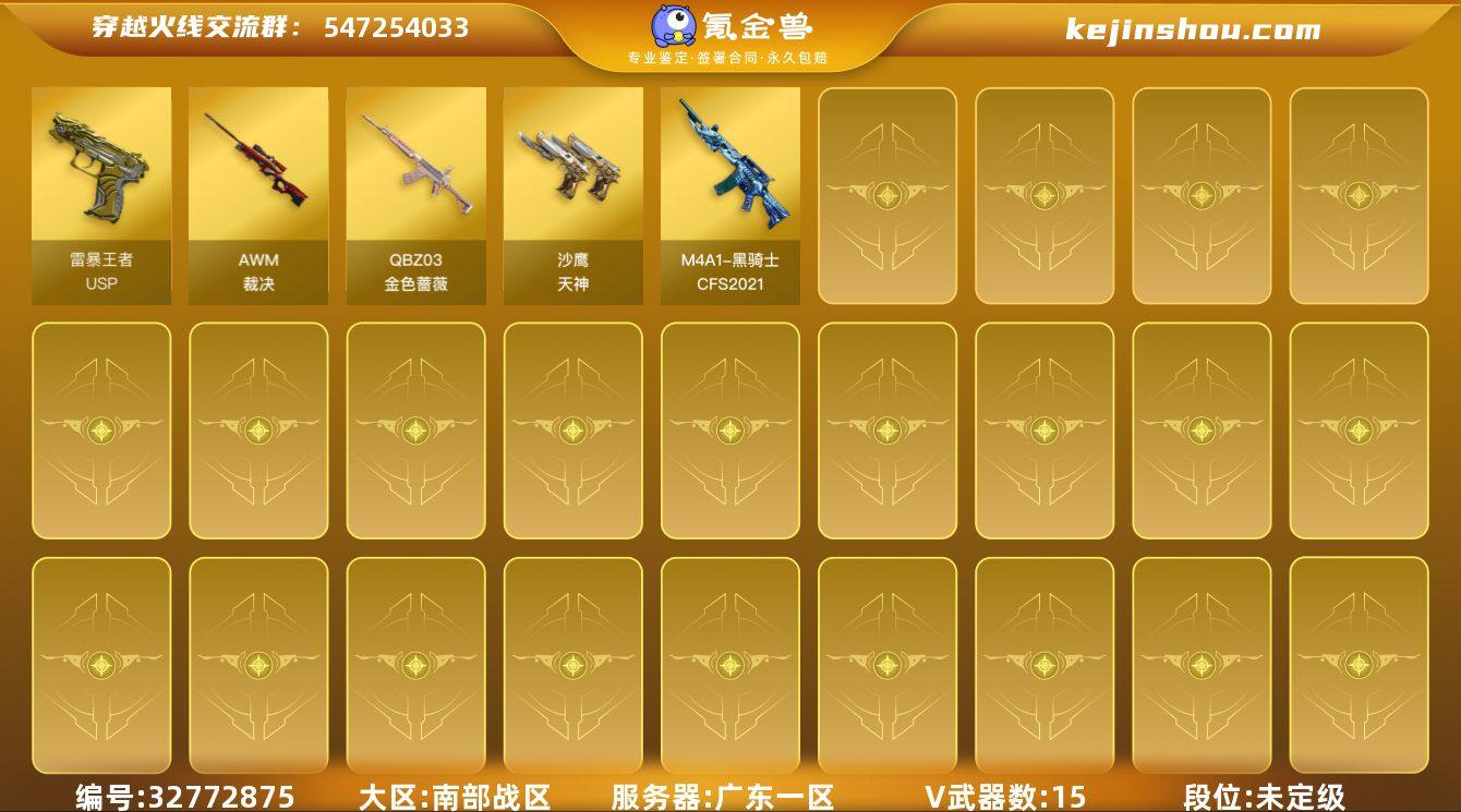 广东一区-22V-6王者武器数-0炫金武器数 【热门武器】:QBZ03-金色蔷薇 【王者炫金武器】:USP-雷暴王者 【皮肤】:雷神-CFS十周年纪念版 皮肤,黑骑士-CFS2021 【角色】:妮妮,战地猎狐,奇洋探员,云海玲珑,疾风,兰妹妹,娜塔莉娅,潘多拉-甜心教官 【人偶武器】:迷你深渊冰龙,迷你裂空之翼 【挑战大师】:神圣爆裂者III,AK47-冰龙粉碎者,机甲撕裂者III,KAC-圣炎切割者III 【英雄级武器】:QBZ03-金色蔷薇,机械迷城-穹宇,AWM-裁决,沙鹰-天神*2,柯尔特-荣耀世冠EP,高爆手雷-神工天巧,高爆手雷-雷暴王者*2,闪光弹-神工天巧,闪光弹-雷暴王者*2,烟雾弹-神工天巧,烟雾弹-雷暴王者,烟雾弹-荣耀世冠EP*2,M4A1-赤狱骑士 【道具】:CFS限定背包,背包-洛丽塔,救世主-黑桃战神,绿色巨人,灵魂忍者,迷雾幽灵,夺命之镰,防化服*3,C4-再燃火线,防弹头盔*3,防弹衣*3,C4工具钳*3,手雷包*3 【特殊枪械】: