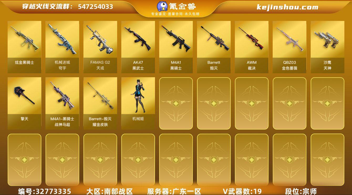 【943159】广东一区-21V-1王者武器数-1炫金武器数 【热门武器】:QBZ03-金色蔷薇,牛牛-AK47,M4A1-黑骑士 【王者炫金武器】:王者冰锋,炫金骑士 【音效卡】:M4A1-黑骑士音效卡,AWM-裁决音效卡 【皮肤】:裁决-叶芒苍灵 皮肤,毁灭耀金皮肤,黑骑士-战神马超 【角色】:机械姬,零·纪元,奇洋探员,乔伊教练,修道士,云海玲珑,暗夜-X,初恋灵狐,娟娟,蜀雪,雪莉杨 【人偶武器】:牛牛-AK47 【挑战大师】:激光毁灭者III-白马银枪,试炼破坏者III 【英雄级武器】:M4A1-黑骑士,AK47-黑武士,FAMAS G2-天戎,QBZ03-金色蔷薇,机械迷城-穹宇,Barrett-毁灭,AWM-裁决,沙鹰-天神,擎天,闪光弹-玄豹,烟雾弹-堕天神 【源级武器】:源-千变,魂·雷神-神秘按键,御·雷神-葫芦兄弟,魂·HK417-朱雀-凤灵,灵·Barrett-朱雀-炫光,加特林-炼狱-掌火,魂·天神-宇航兔兔,源·擎天-萌杀 【道具】:BS战队炫彩背包,云山科技背包,女皇终结者-背包,炫彩背包,超级背包,女皇终结者-魔龙之吻,救世主-黑桃战神,绿色巨人,灵魂忍者,迷雾幽灵,夺命之镰,防化服*3,流光-鎏金之域,动感闪耀表情,C4-沙漠,防弹头盔*3,防弹衣*3,C4工具钳*3,手雷包*3 【特殊枪械】:1黑骑士