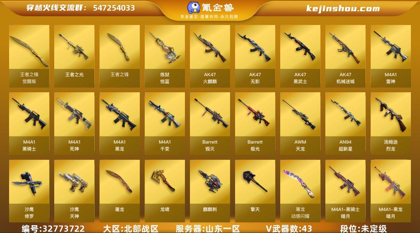 山东一区-48V-4王者武器数-0炫金武器数 【热门武器】:死亡之眼,M4A1-黑骑士,汤姆逊-烈龙,沙鹰-修罗*2 【王者炫金武器】:王者凌虎,王者之光,炼狱-悦蓝,王者之锋 【音效卡】:M4A1-黑骑士音效卡,Barrett-碧霄极光音效卡,炼狱-百战金芒-庆典舞曲音效卡 【皮肤】:毁灭-暗月*3,毁灭-英雄计划 皮肤,黑龙-暗月,黑骑士-暗月,无影-能量核心,死神-秘银*2,天启-暗月,天龙-秘银,极光-能量核心,修罗-能量核心*2,天神-暗月,屠龙-荣耀之锋,屠龙-惊鸿 皮肤,轻型军用手斧-再燃火线 【角色】:葵,王者之瞳,奇洋探员,乔伊教练,修道士,云海玲珑,风暴女,疾风,兰妹妹,灵狐者-X,潘多拉-甜心教官,斯沃特-X,铁骑荣耀,兔囡囡,维纳斯,影武者-X,智影 【人偶武器】:AWM-灵狐-15周年嘉年华,迷你牛牛 【暴走生化】:死亡之眼 【英雄级武器】:M4A1-千变,AK47-火麒麟,M4A1-黑龙,M4A1-雷神*3,M4A1-黑骑士,AK47-无影,M4A1-死神,AK47-黑武士,AN94-超新星,AK47-机械迷城,AWM-天龙,Barrett-毁灭*3,Barrett-极光*2,Barrett-金色蔷薇*2,汤姆逊-烈龙,沙鹰-修罗*2,沙鹰-天神,屠龙*5,龙啸,擎天*3,麒麟刺,麒麟刺-百战金芒,丛林匕首-玄豹,高爆手雷-玄豹...