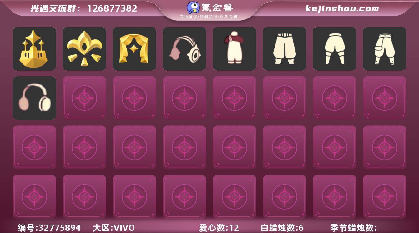 vivo渠道七季奶14白枭巫师蜘蛛斗武士裤 蜡烛数量:6 翼数量:143 爱心:12 已经毕业地图:晨岛,云野,雨林,霞谷,暮土,禁阁 已经毕业季节:表演季,集结季,梦想季,圣岛季 稀有礼包:彩虹耳机,巫术犄角,蛛网朋克,巫师帽,绊爱套装,创始人礼包,蜘蛛斗篷,情人秋千,茶桌 热门物品:正太头,樱花头,猫猫头,搓澡巾,武士裤,白棉裤,背带裤,宴会围巾,红耳机,黄鼠狼面具,红狐狸面具,灯泡斗篷,白金斗篷,高音钢琴,排箫,雨伞 身高 2.38-14.38 当前2.67