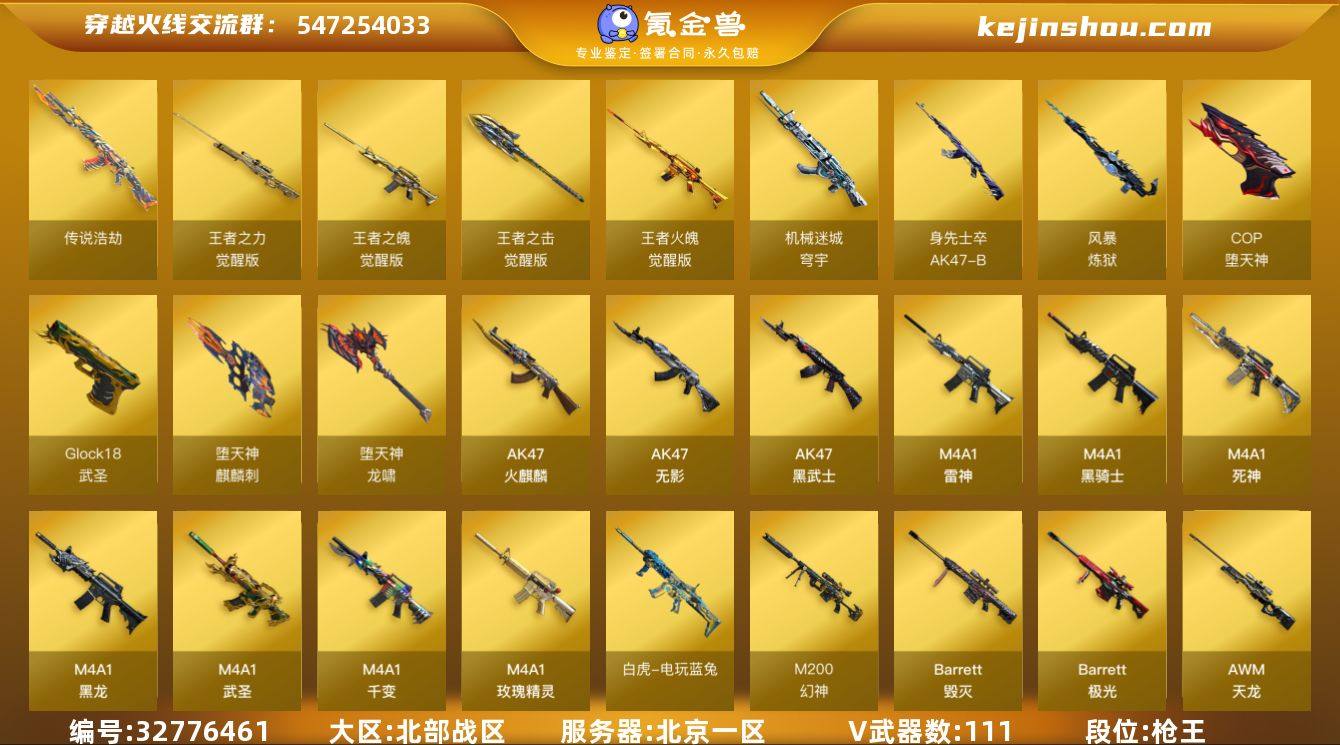 【943262】北京一区-120V-6王者武器数-0炫金武器数 【传说武器】:传说浩劫 【热门武器】:传说浩劫,QBZ03-金色蔷薇,HK417-朱雀,M200-幻神,死亡之眼,荣耀世冠-火麒麟,白虎-电玩蓝兔,荣耀世冠-柯尔特,Kar98K-星神,M4A1-黑骑士,汤姆逊-烈龙*6,RPK-盘龙*3,加特林-炼狱,斯泰尔-蝴蝶,USP-雷暴,COP-堕天神,沙鹰-修罗*3,荣耀世冠-龙啸,金刚伞 【王者炫金武器】:王者之魄闪光弹*2 【音效卡】:M200-幻神音效卡,AK47-火麒麟音效卡,M4A1-雷神音效卡,M4A1-黑骑士音效卡,Barrett-毁灭音效卡,QBZ03-金色蔷薇音效卡 【皮肤】:幻神-冠军之幻,幻神-KZ-CFPLS25冠军 皮肤,裁决-运输船 皮肤,雷神-暗月,雷神-能量核心,雷神-荣耀之魄,火麒麟-雷神,火麒麟-平天大圣,毁灭-荣耀之怒,毁灭-星空,毁灭-冠军之怒,毁灭-风暴*2,毁灭-英雄计划 皮肤,M4A1-千变-孔明皮肤,黑龙-能量核心,黑龙-暗月,黑骑士耀金皮肤,黑骑士-地狱火,无影-能量核心,无影耀金皮肤,死神-秘银*2,战神-粉色甜心皮肤*2,战神-紫绶金章皮肤,战神-流金岁月皮肤,AK47-B-常胜将军-曹操*2,AK47-B-常胜将军-刘备,AK47-B-常胜将军-孙权,天龙-能量核心,AWM-天龙-传奇70KG,极光-能量核心,屠...