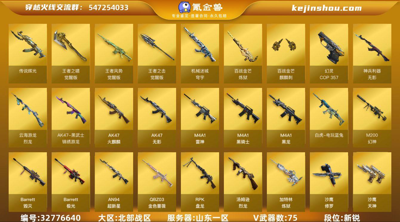 山东一区-87V-4王者武器数-0炫金武器数 【传说武器】:传说辉光 【热门武器】:传说辉光,QBZ03-金色蔷薇,M200-幻神,死亡之眼,白虎-电玩蓝兔,炼狱-迷你小钢,M4A1-黑骑士,汤姆逊-烈龙,RPK-盘龙*6,加特林-炼狱,COP-白鲨,COP 357-幻灵,沙鹰-修罗*5,黄金猫猫手套-白鲨,金刚伞 【音效卡】:M4A1-黑骑士音效卡,Barrett-毁灭音效卡,Barrett-极光音效卡,炼狱-百战金芒-庆典舞曲音效卡 【皮肤】:M200-幻神-黄忠皮肤,M200-幻神-荣耀世冠白鲨,QBZ03-荣耀世冠白鲨,雷神-暗月,雷神-荣耀之魄,雷神-宇航兔皮肤,雷神-源计划2.0专属 皮肤,M4A1-再燃火线,火麒麟-雷神,火麒麟-心动糖果,毁灭-冠军之怒,毁灭-航天科技皮肤,毁灭-英雄计划 皮肤,黑龙-能量核心,黑龙-暗月,黑骑士耀金皮肤,黑骑士-AG-S4冠军典藏,战神-粉色甜心皮肤,战神-紫绶金章皮肤,战神-流金岁月皮肤,AK47-B-常胜将军-曹操,炼狱-玩具枪皮肤,修罗-能量核心,修罗-冠军之魂*2,屠龙-春桃 皮肤,龙啸-纸灯龙皮肤,轻型军用手斧-再燃火线 【角色】:葵,樱,战地猎狐,王者-葵-貂蝉,王者-迷迭香,乔伊教练,云海玲珑,葵-阿尔法武装,暗夜-X,北极狐-X,芳心审判者,风暴女,嘉年华灵狐,兰-新年...