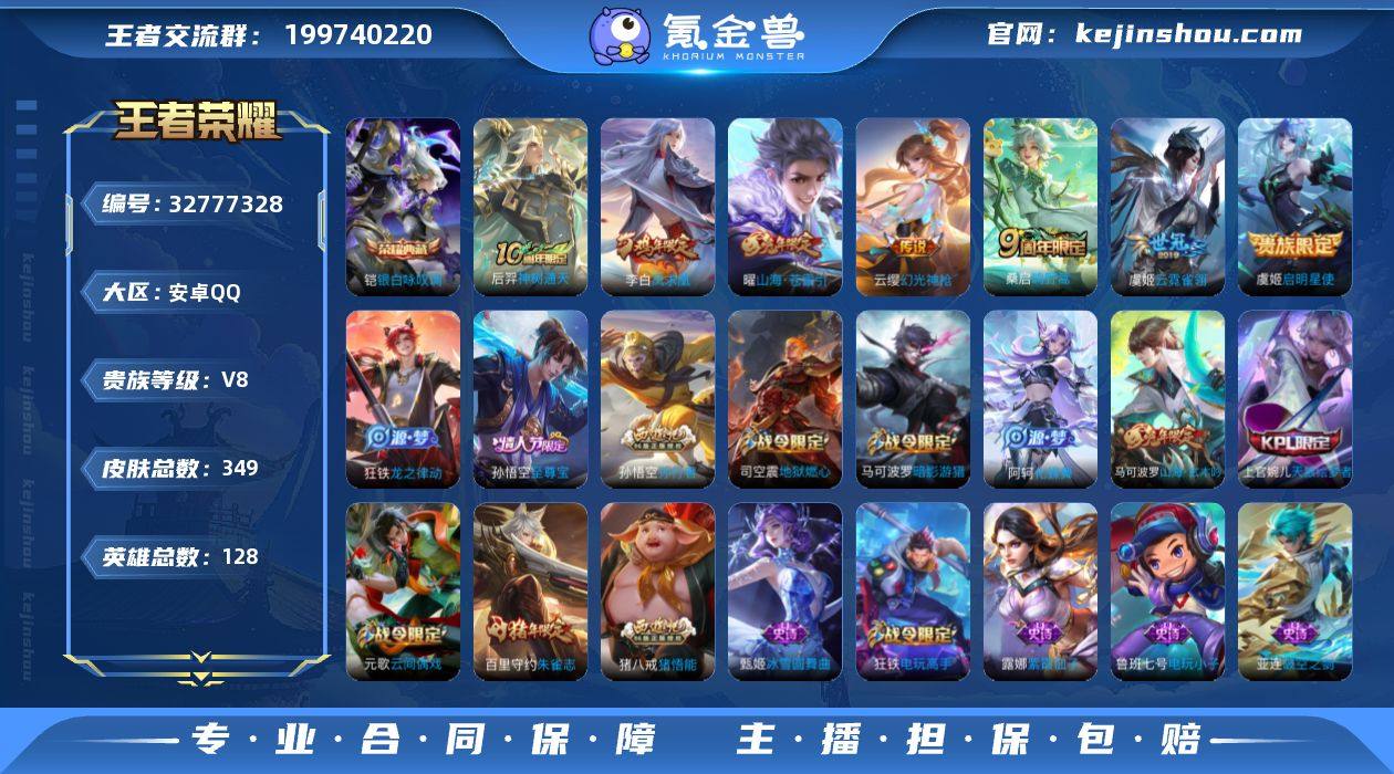 【王者荣耀】珍品无双0 典藏1 无双0 珍品传说0 传说9 史诗102 英雄128 皮肤349 贵族8级 荣耀典藏:银白咏叹调__传说皮肤:鸣野蒿|启明星使|云霓雀翎|狄仁杰-超时空战士|孙尚香-末日机甲|凤求凰|山海·苍雷引|幻光神枪|神树通天__稀有限定:至尊宝|朱雀志|蔷薇恋人|孙行者|猪悟能|李小龙|梁祝|山海·玄木吟|拒霜思|暗影游猎|百解令|大漠名商|地狱燃心|电玩高手|繁星吟游|高山流水|古海寻踪|海滩派对|海盐诗旅|航海奇遇记|后羿-如梦令|胡桃异想国|华丽摇滚|幻夜卜梦|皇家上将|混沌棋|火炮绅士|剑破天穹|江河有灵|金庭之子|镜-真我赫兹|狂想玩偶喵|黎明之约|迷踪丽影|魔术师|女武神|千军破阵|擒涛扼浪|青焰无极|驱傩正仪|燃音魔法|沙漠行僧|朔风刀|死亡摇滚|探海日志|醍醐杖|天狼绘梦者|天狼溯光者|天狼运算者|天穹祈灯|万华元夜|无心|五谷丰年|午后时光|纤云弄巧|星界游侠|星空之诺|驯魔猎人|演武夺筹|夜都怪侠|疑决卦|阴阳师|吟游魔法|银河之约|优雅恋人|游园惊梦|驭风魔法|御旌|御銮|原初追逐者|云间偶戏|真爱魔法|暗夜贵公子|暗隐猎兽者|缤纷独角兽|冰雪圆舞曲|苍穹之光|乘风破浪|大乔-猫狗日记|德古拉伯爵|地狱岩魂|电玩·爆裂旋风|电玩小子|功夫厨神|鬼剑武藏|黄金分割率|箭羽风...