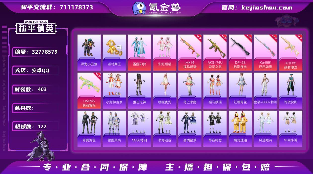 漂亮公主素材号/【雪国/金鞋/彩虹甜喵/冷酷挑战者】深海小丑鱼/浪漫天命/小丑鱼/小鲨鱼/地铁36点天赋 实名: 可修改 时装数: 403 枪械数: 122 战备数: 90 热门装扮: 呆萌铁蟹,深海小丑鱼,迅捷狂鲨,鹰眼刺客,雪国幻梦,彩虹甜喵,派对舞王 稀有枪皮: Kar98K-巳巳如意,DP-28-豹影疾电,AKS-74U-森灵之息,ACE32-萌骑漫游,UMP45-萌骑冒险
