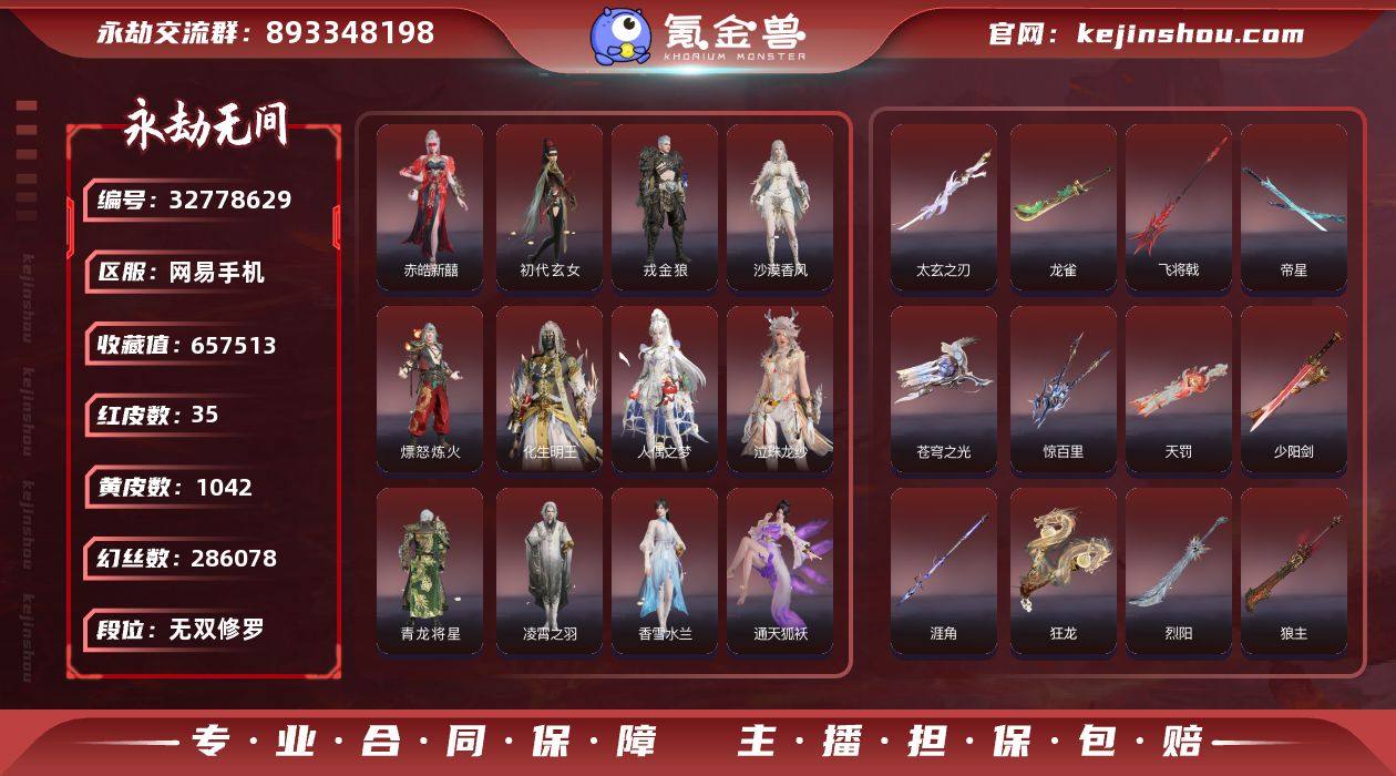 35红1034金|等级718|收藏值653017|无间修罗|幻丝245618|金砖1289|通行证Lv.68 红色神品:墨离,凌霄之羽,香雪水兰,暮光胴丸,沙漠香风,监兵凶神,夜魅游莹,通天狐袄,星辉魔纱,化道者,执明神君,流金晓锦,守墨麒,逐光者,化生明王,新倩女幽魂·长天藏锦,戎金狼,赤皓新囍,初代玄女,熛怒炼火,人偶之梦,泣珠龙纱,青龙将星,天罚,苍穹之光,帝星,龙雀,烈阳,狼主,飞将戟,涯角,少阳剑,狂龙,惊百里,太玄之刃 角色金色皮肤:P5R·雨宫莲JOKER,黄庭道,梨园传奇·柳生,封神录·申公豹,司天命,幽篁山鬼,朝闻道,未济袍,金羽客,若谷,禄运玉霄,紫微星命,封神录·龙吉公主,藏雨阁主,金襦玉衫,夏日派对·仲夏霜华,寒英素雪,姑射真人,玄青郁离,祸津素盏,斗魂,麟鹿大铠,花之倾奇,苍雷丸,倒反阴阳·凛冬,巅峰极速·蕾雅,千秋匠心·玉叶景,长歌诗韵·胡旋女,观山海·青鸟,神鹰之女,火罗圣女,龙门·飞天,惊云羽,浣烟纱,龙之道·求真,璨银魔枭,瀚海苍鹰,福瑞天泽,葫芦兄弟·蛤蟆头领,街头狂欢·不败擂主,观山海·秋神蓐收,行空裘,冬无归,干将莫邪,护世